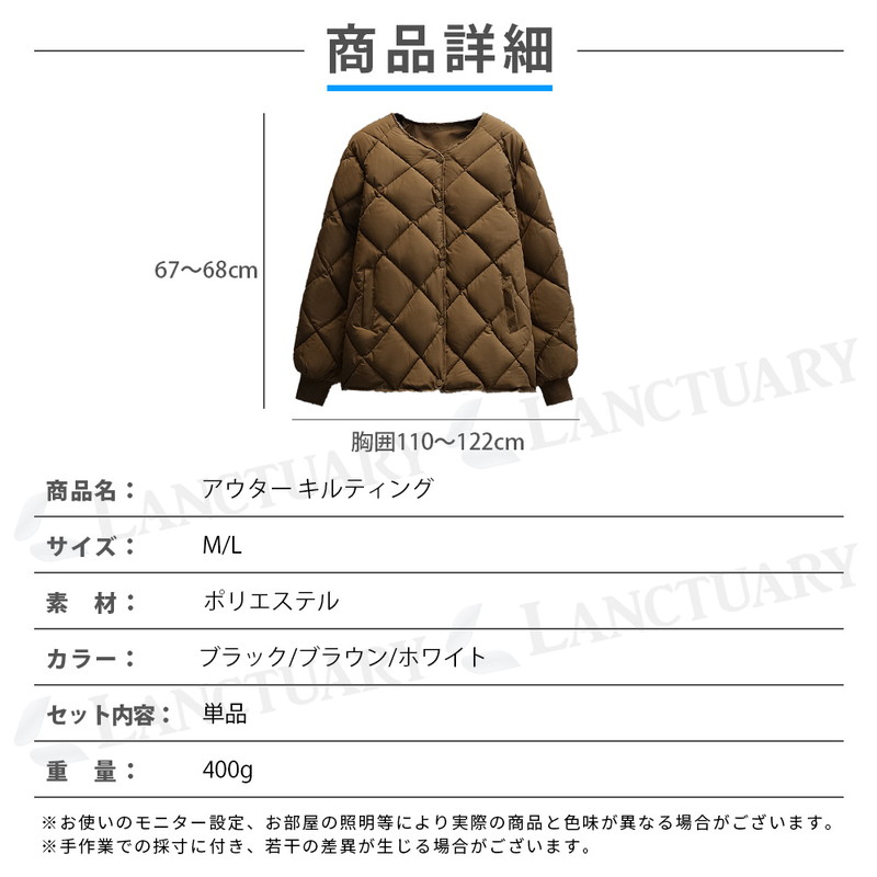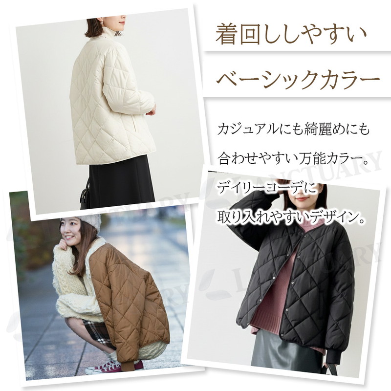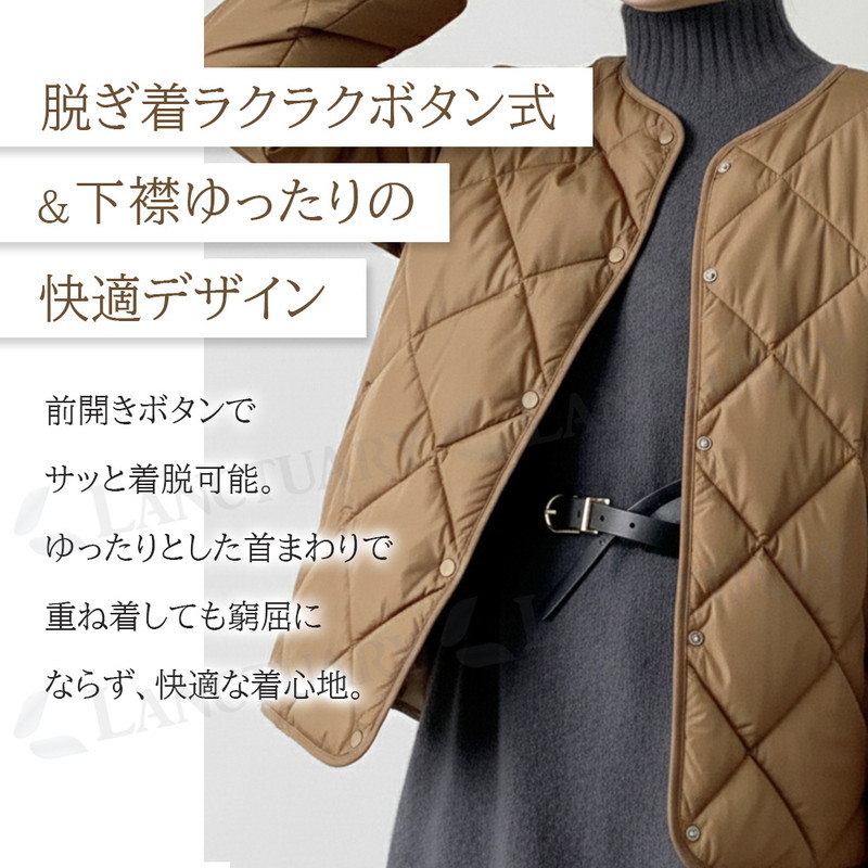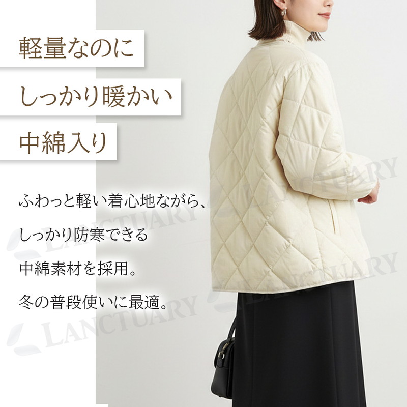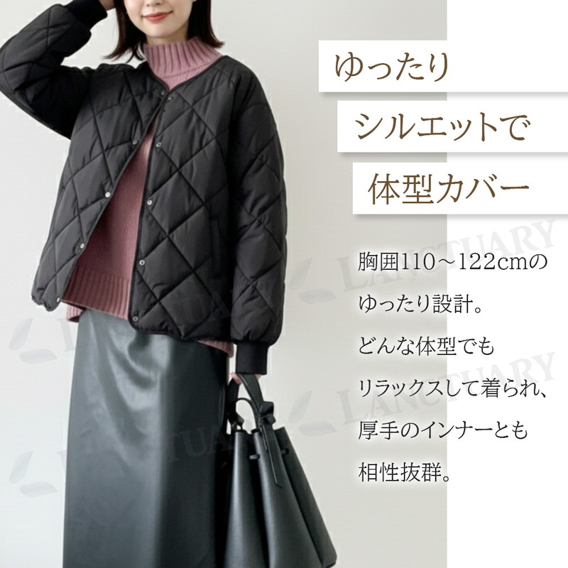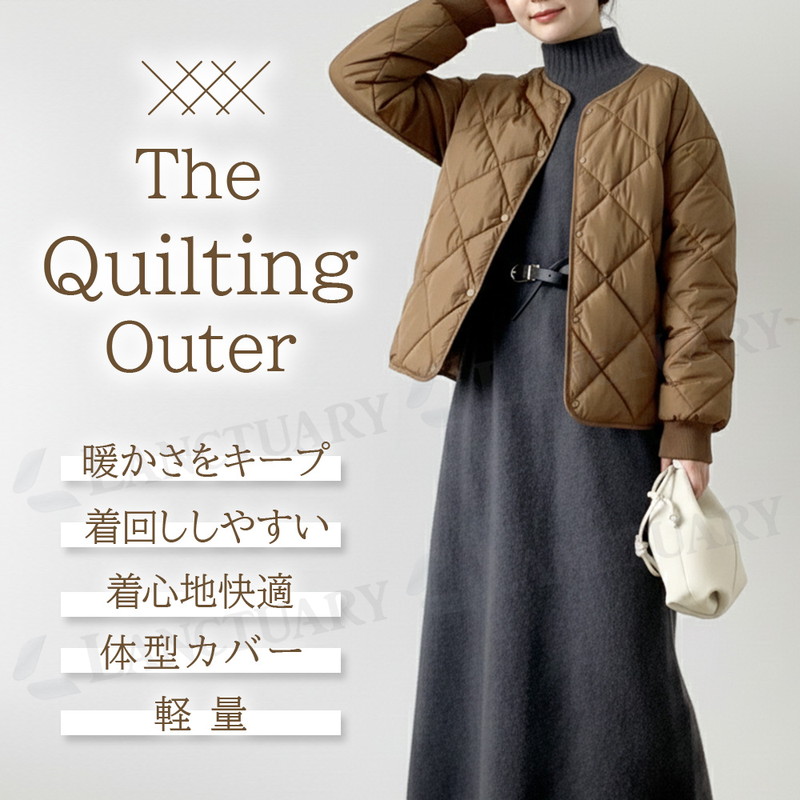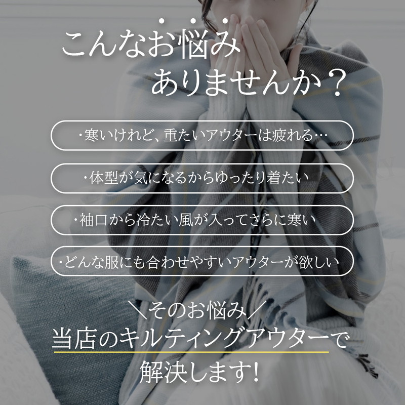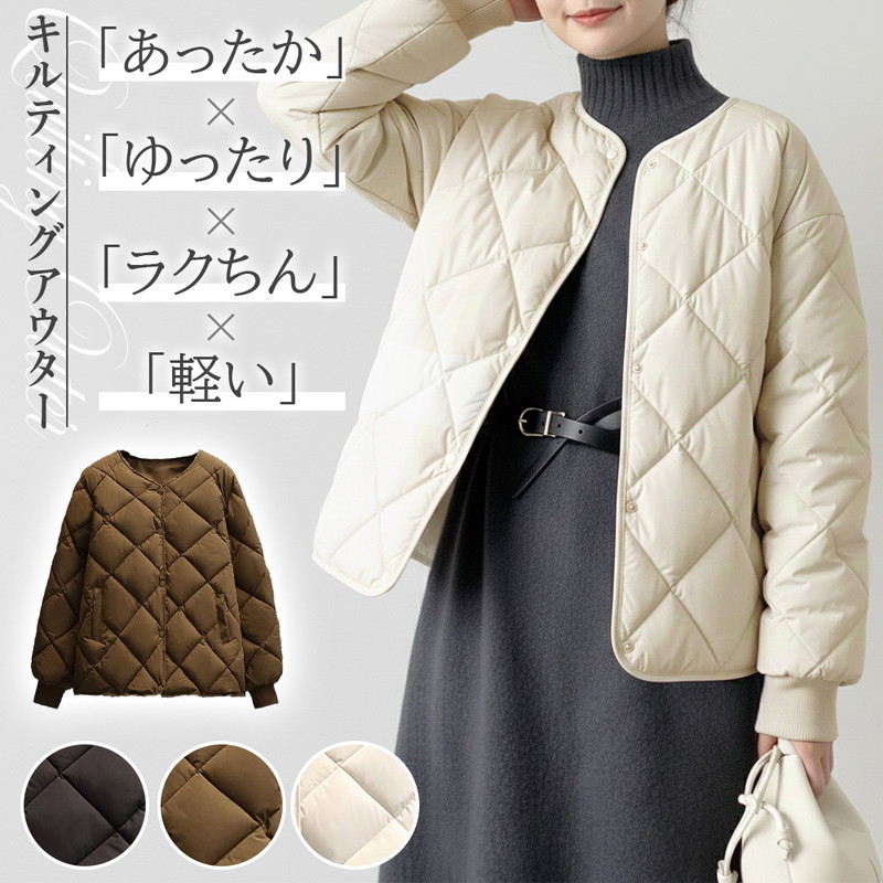 | こちらのキルティングアウターは、 「軽さ」「暖かさ」「着やすさ」「合わせやすさ」 すべてを叶えた、冬のマストアイテムです。ふんわり軽い着心地なのに、冬の冷たい空気をしっかりガード。 重たいアウターが苦手な方でもストレスなく着られます。 普段使いから通勤・お出かけまで万能。厚手ニットもゴワつかず着られます。 「お腹まわりが気になる」そんな方にも嬉しいシルエット。リブ袖で冷たい風の侵入を防いで、暖かさをキープします。ブラック、ブラウン、ホワイトの合わせやすい3色展開。どれもデイリーに使いやすいカラーで、着回し力抜群。前が全開するボタン式なので、 サッと着られてサッと脱げる使いやすさも魅力。 首まわりは少し余裕があり、重ね着しても苦しくありません。軽くて暖かいアウターを探している、体型カバーできるシルエットが欲しい、毎日コーデに使いやすいデザインがいい、黒・白・ブラウンの定番で上品なカラーが好き、 防風性のあるアウターが欲しい、という方におすすめです。 |