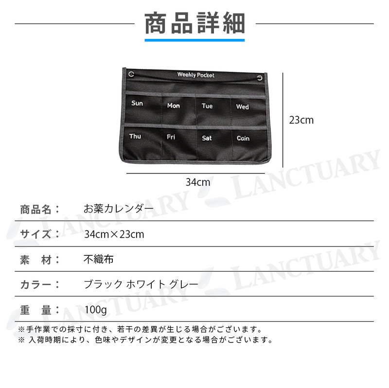 | 商品名:お薬カレンダー 素材:不織布 サイズ:横34cm×縦23cm 重さ:100g カラー:ブラック グレー ホワイト |