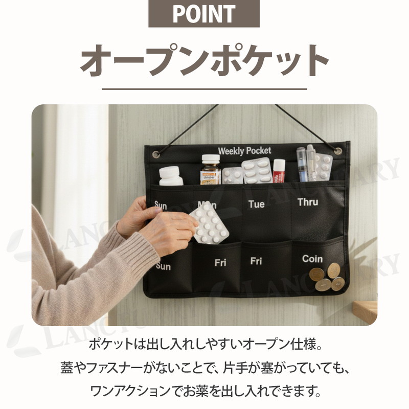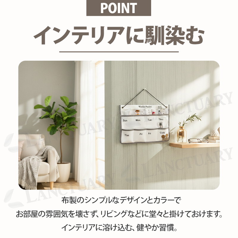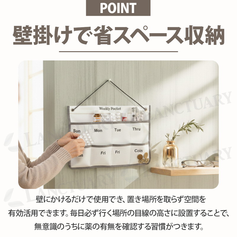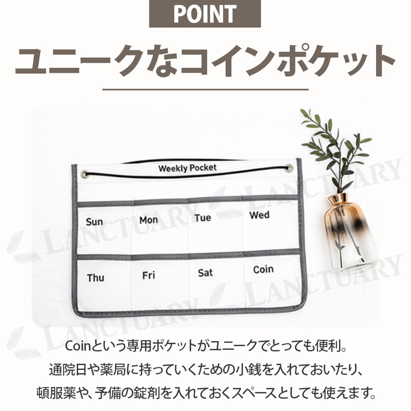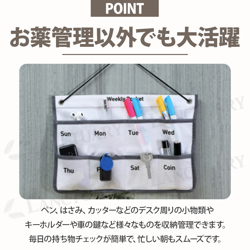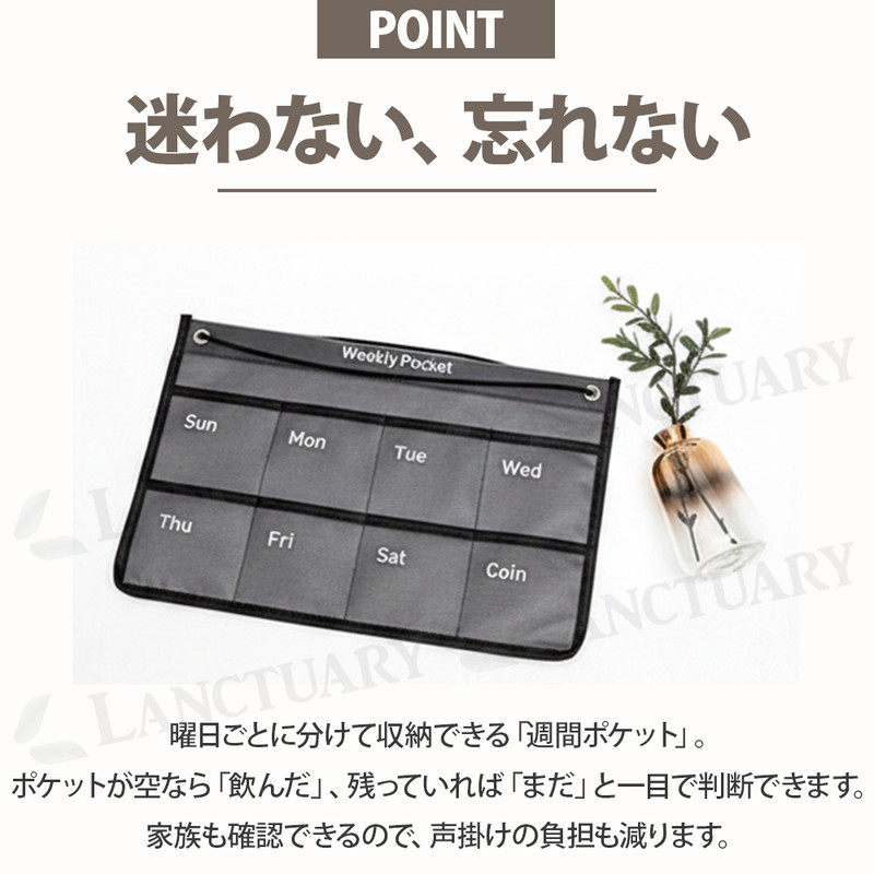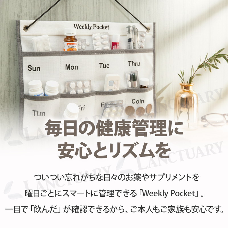 | 暮らしを整え、安心を届ける。 毎日の健康管理をもっと楽に快適にしてくれるお薬カレンダーが登場しました! 月曜日から日曜日まで曜日が分かりやすくプリントされており、お薬やサプリメントをセットしておけば、ポケットの空き具合で「飲んだ・飲んでいない」が一目瞭然。 スムーズな出し入れを可能にする蓋のないオープンポケットを採用し、ワンアクションでサッと手軽に取り出せます。 右下には小銭や予備の薬を入れたりできるCoinポケットを配置。 病院の診察代やタクシー代などを管理しておけます。 壁を有効活用する省スペース設計でお部屋をスッキリと保ちます。 毎日必ず行く場所の目線の高さに設置することで、無意識のうちに薬の有無を確認する習慣がつきます。 お部屋のデザインを壊さないシンプルでモダンなデザインでリビングなどでも堂々とかけておけます。 ペン、ハサミ、印鑑、鍵、イヤホンなどお薬管理だけじゃない、多彩な使い方が可能です。 あなたの日常にある小さな不安を「安心」に変え、より心地よい暮らしを創るためのお薬カレンダー。 ぜひこの機会にお試しください! |