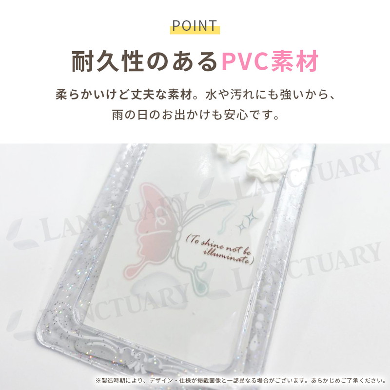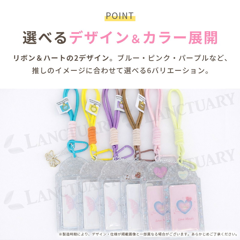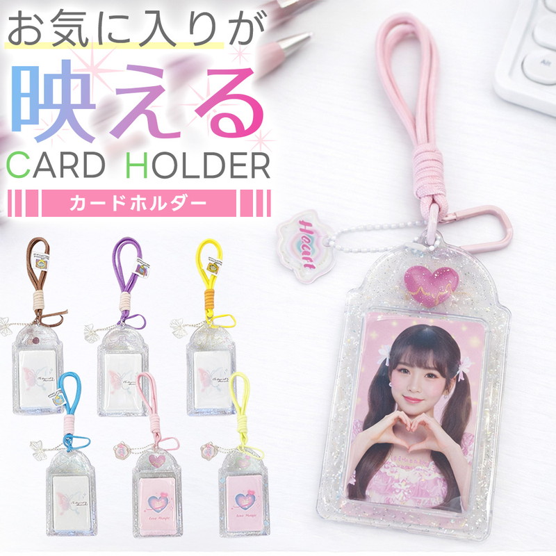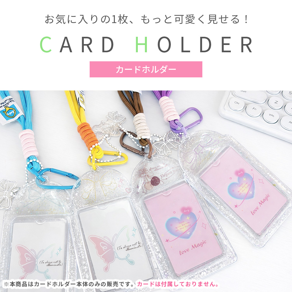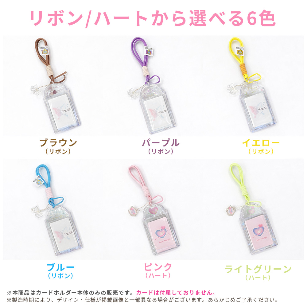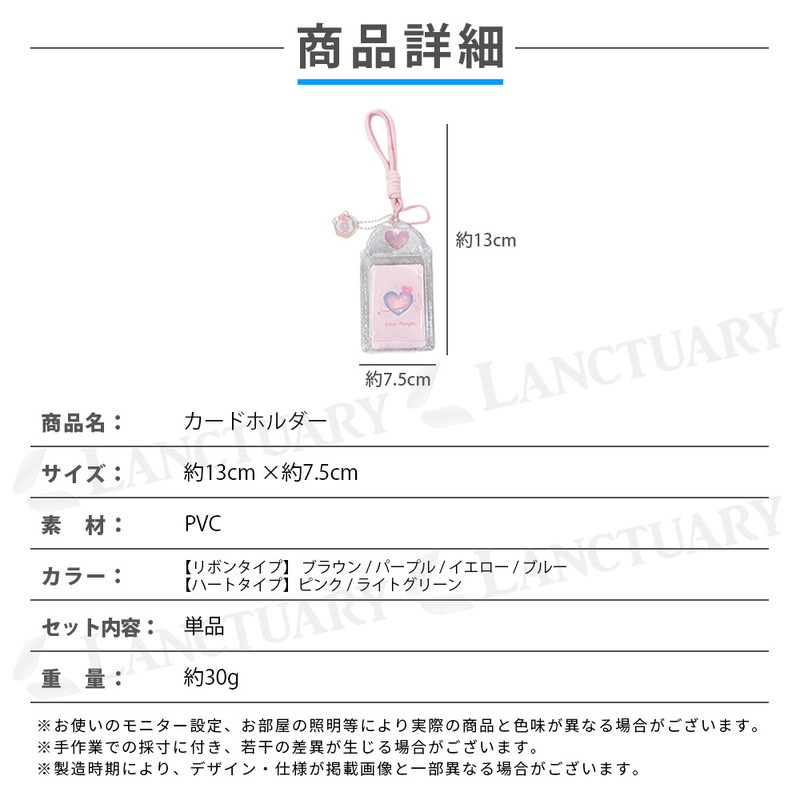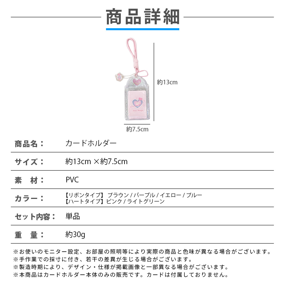| 商品名:カードホルダー サイズ:13cm × 7.5cm 素材:PVC 重量:約30g デザイン:リボン(4色)、ハート(2色) |