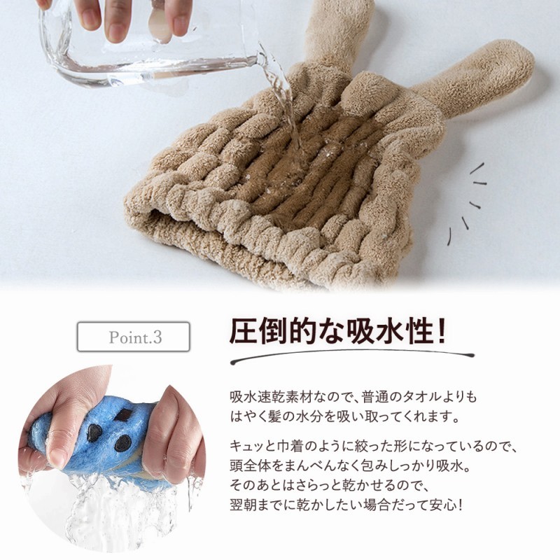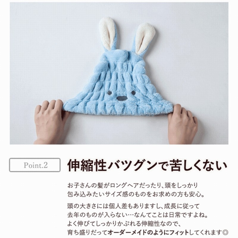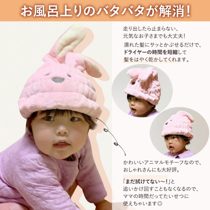 | 商品の説明 | 見た目もとってもキュートなタオルキャップ。 吸水速乾素材なので、普通のタオルよりもはやく髪の水分を吸い取ってくれます。 キュッと巾着のように絞った形になっているので、頭全体をまんべんなく包みしっかり吸水。 そのあとはさらっと乾かせるので、翌朝までに乾かしたい場合だって安心! 濡れた髪にサッとかぶせるだけでドライヤーの時間を短縮して 髪をはやく乾かしてくれます。 「まだ拭けてない!」と追いかけ回すこともなくなるので、 ママの時間だってたいせつに使えちゃいます◎ おうちでいるときももちろん、海水浴や旅行、学校行事など 「お子さま一人で髪をすばやく乾かしたい!」ってときに おすすめなのがアニマルタオルキャップ。 存在感のあるかわいいタオルキャップで、 忘れずしっかりと髪を乾かすことができちゃいます。 豊富なカラーバリエーションは、家族皆で使えるのはもちろん、贈り物にも最適。 多兄弟だって自分のカラーを選んで毎日使えるので、 お風呂タイムがちょっぴり楽しくなっちゃいます。 皆が笑顔になれる大人気のタオルキャップをぜひお試しください◎ |