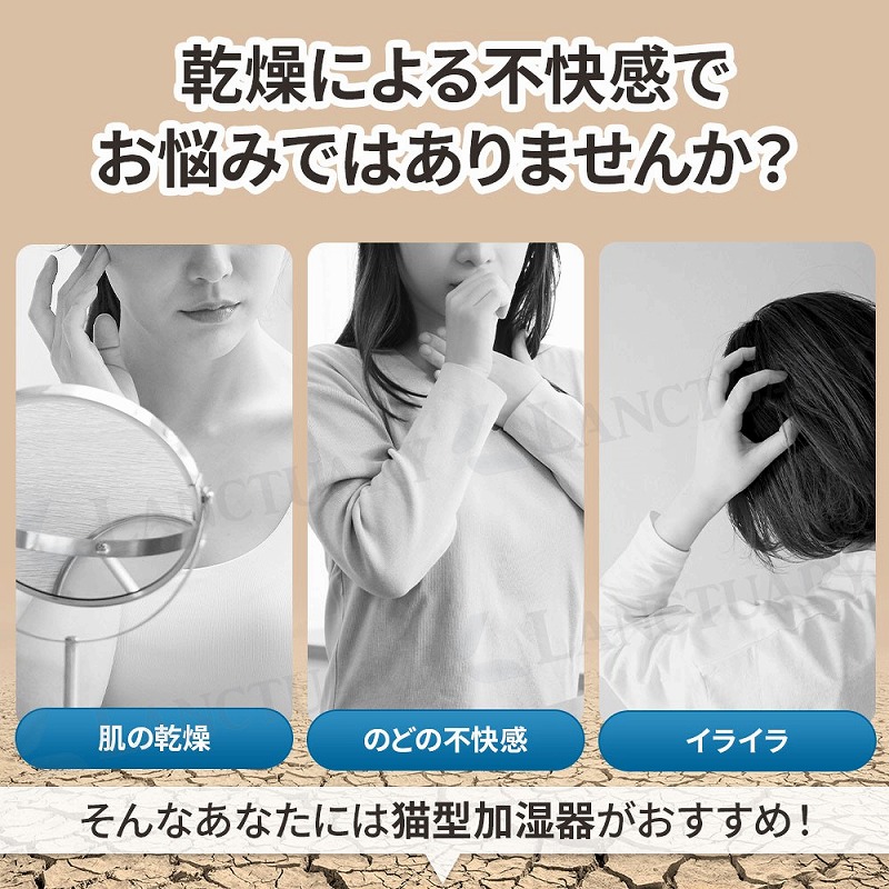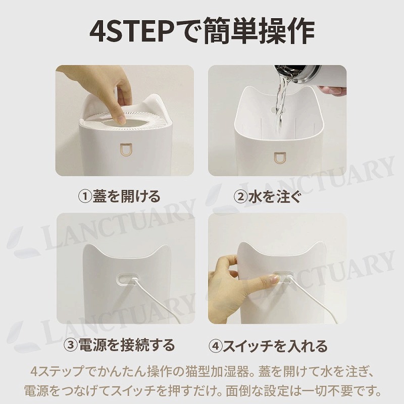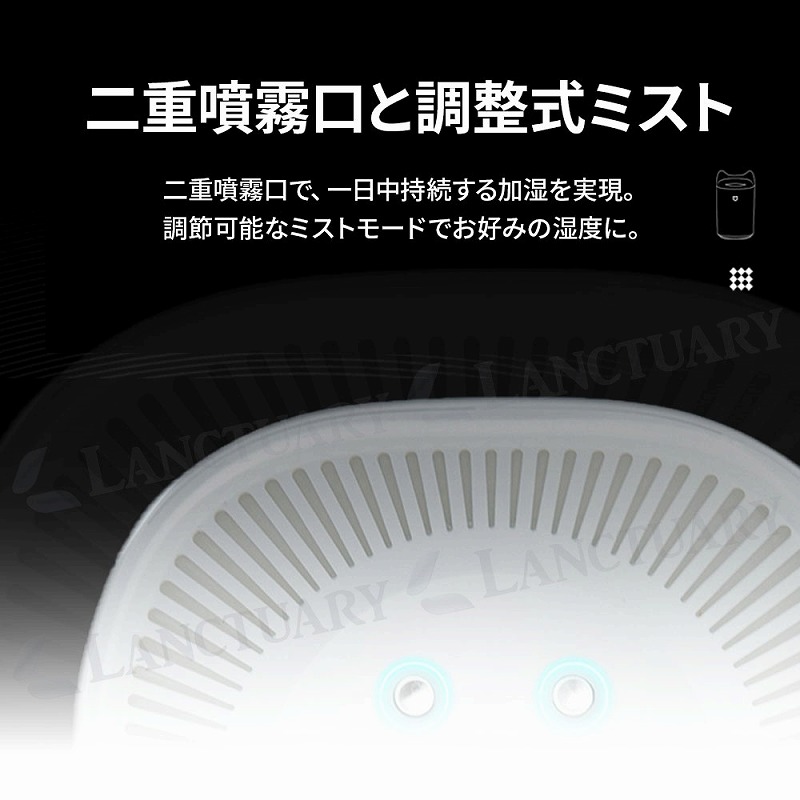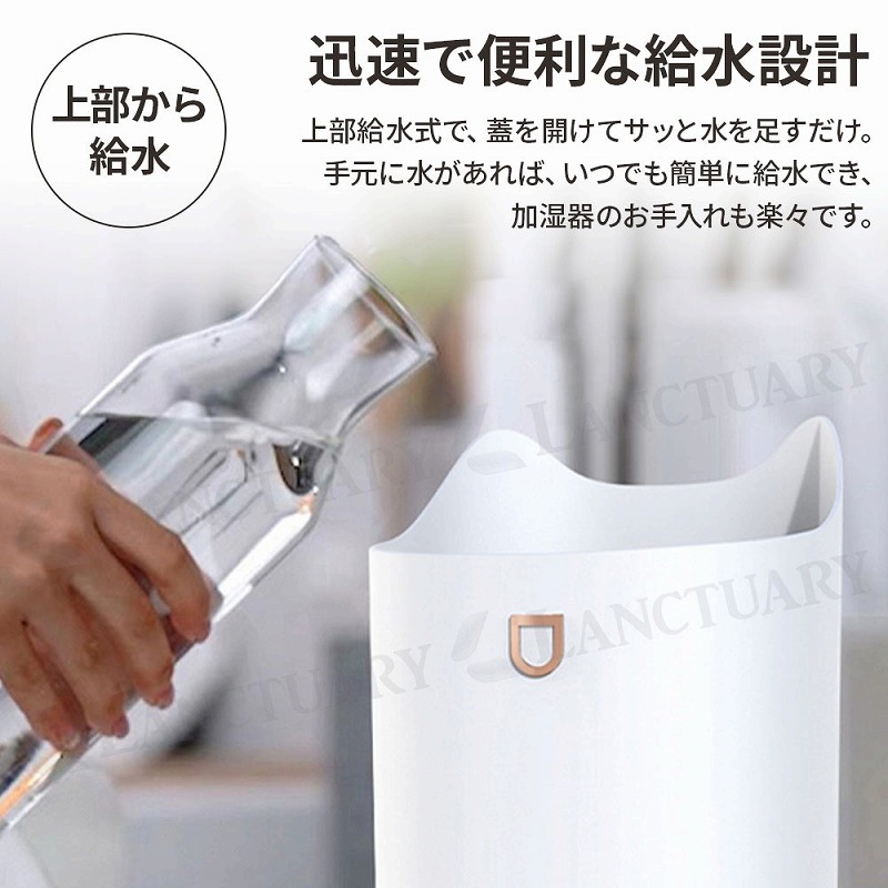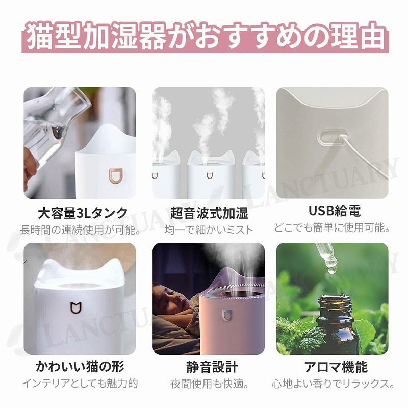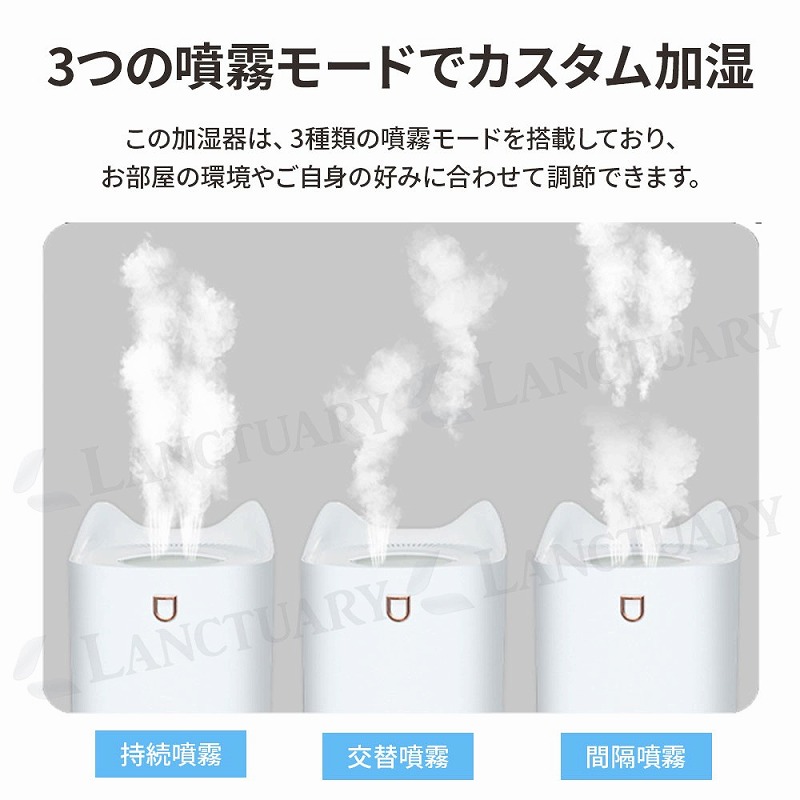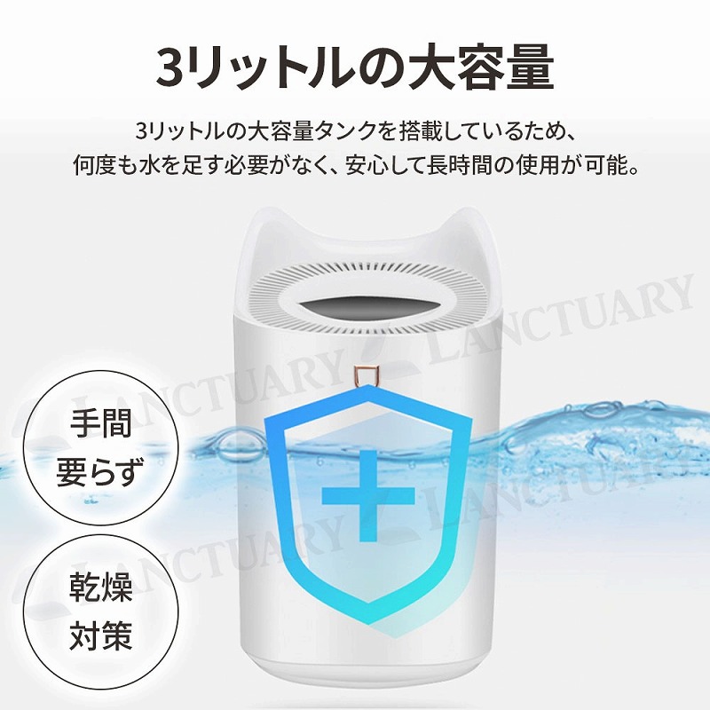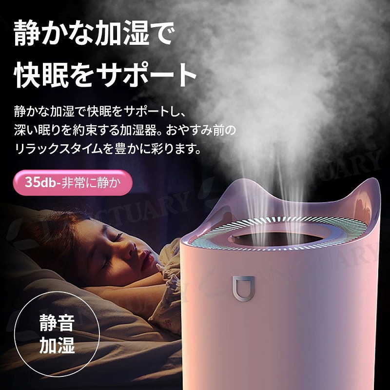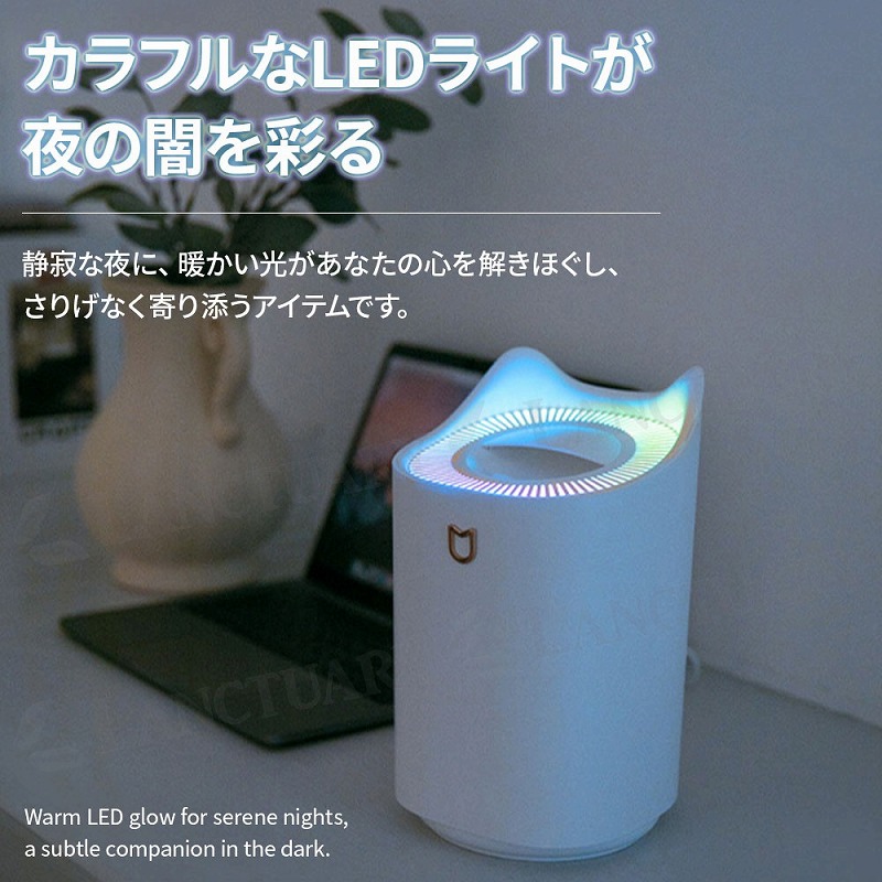 | かわいい猫型のデザインで、お部屋にやさしい湿度と温かみのある光をもたらす加湿器。3リットルの大きな水タンクが、一日中お部屋を心地よい湿度で満たします。USBからの給電で場所を選ばず、オフィスやベッドサイド、子供部屋でも手軽に使えます。静音運転により、夜も静かに潤いを感じながら休めるので、快適な睡眠をサポートします。アロマオイルを数滴加えれば、優しい香りが空間を包み込み、リラックスタイムをより豊かにしてくれます。乾燥が気になる季節や、風邪をひきやすい時期の必需品としても活躍します。毎日の暮らしにさりげない潤いと安らぎを加える、そんな加湿器です。 |