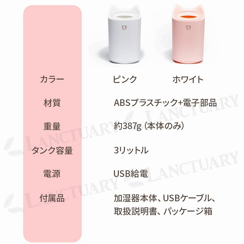 | カラー: ピンク、ホワイト 材質: ABSプラスチック+電子部品 重量: 約387g(本体のみ) タンク容量: 3リットル 電源: USB給電 付属品: 加湿器本体、USBケーブル、取扱説明書、パッケージ箱 |