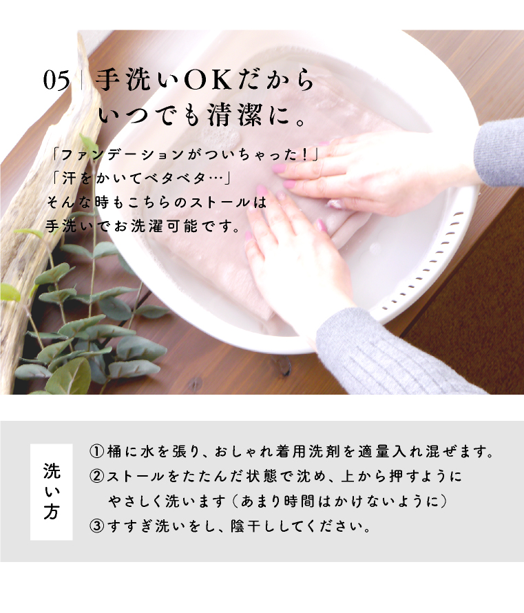 【お洗濯について】お洗濯は色落ちや縮みの原因となりますので、推奨しておりません。どうしても洗濯される場合は個別で手洗いしてください。
