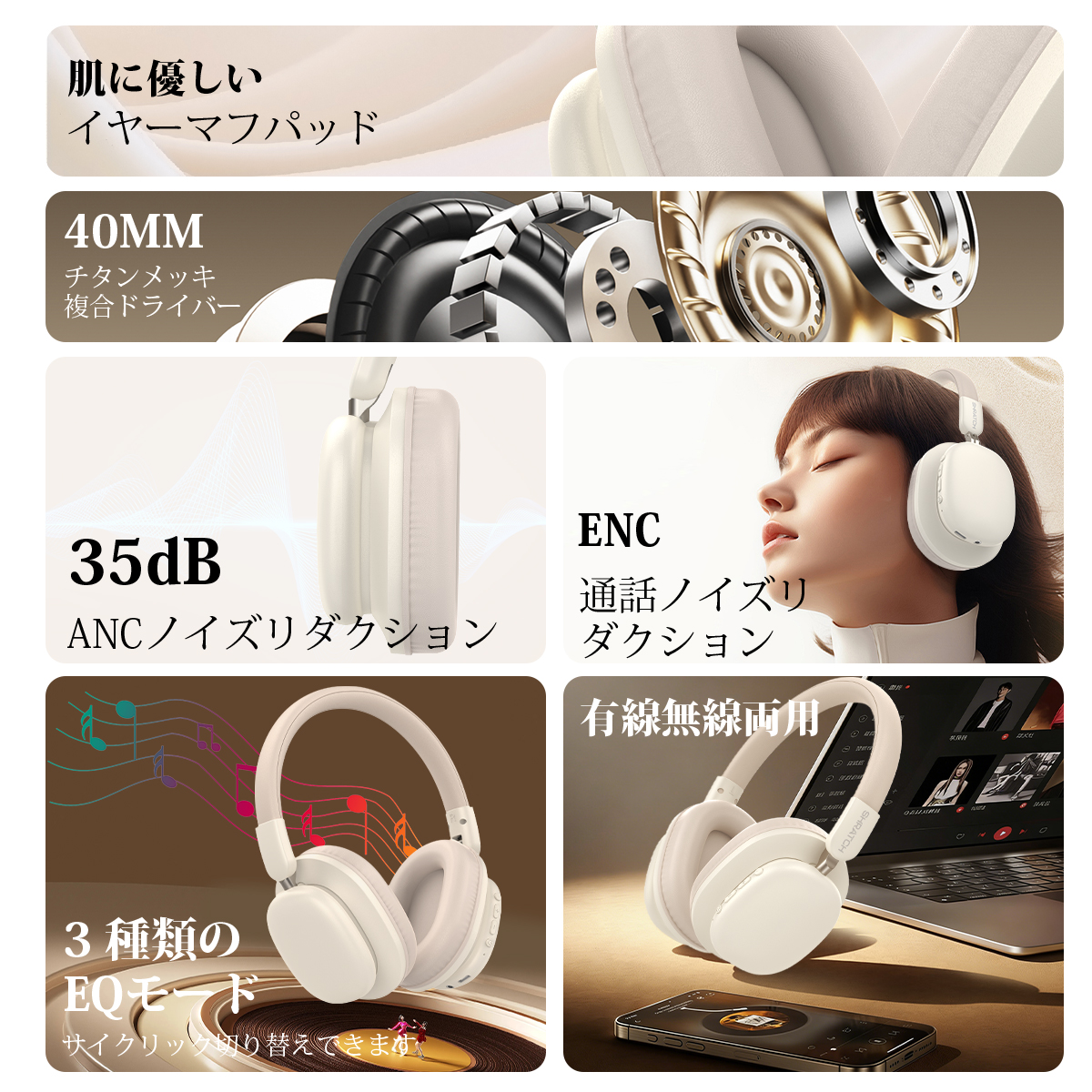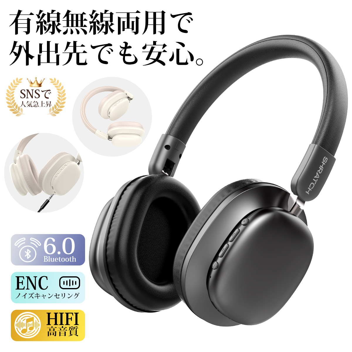 ワイヤレスヘッドホン イヤホン ヘッドホン Bluetooth6.0 ワイヤレスイヤホン 超低遅延 クリア通話 有線無線両用 オーディオケーブル付き 折りたたみ式 SHRATCH