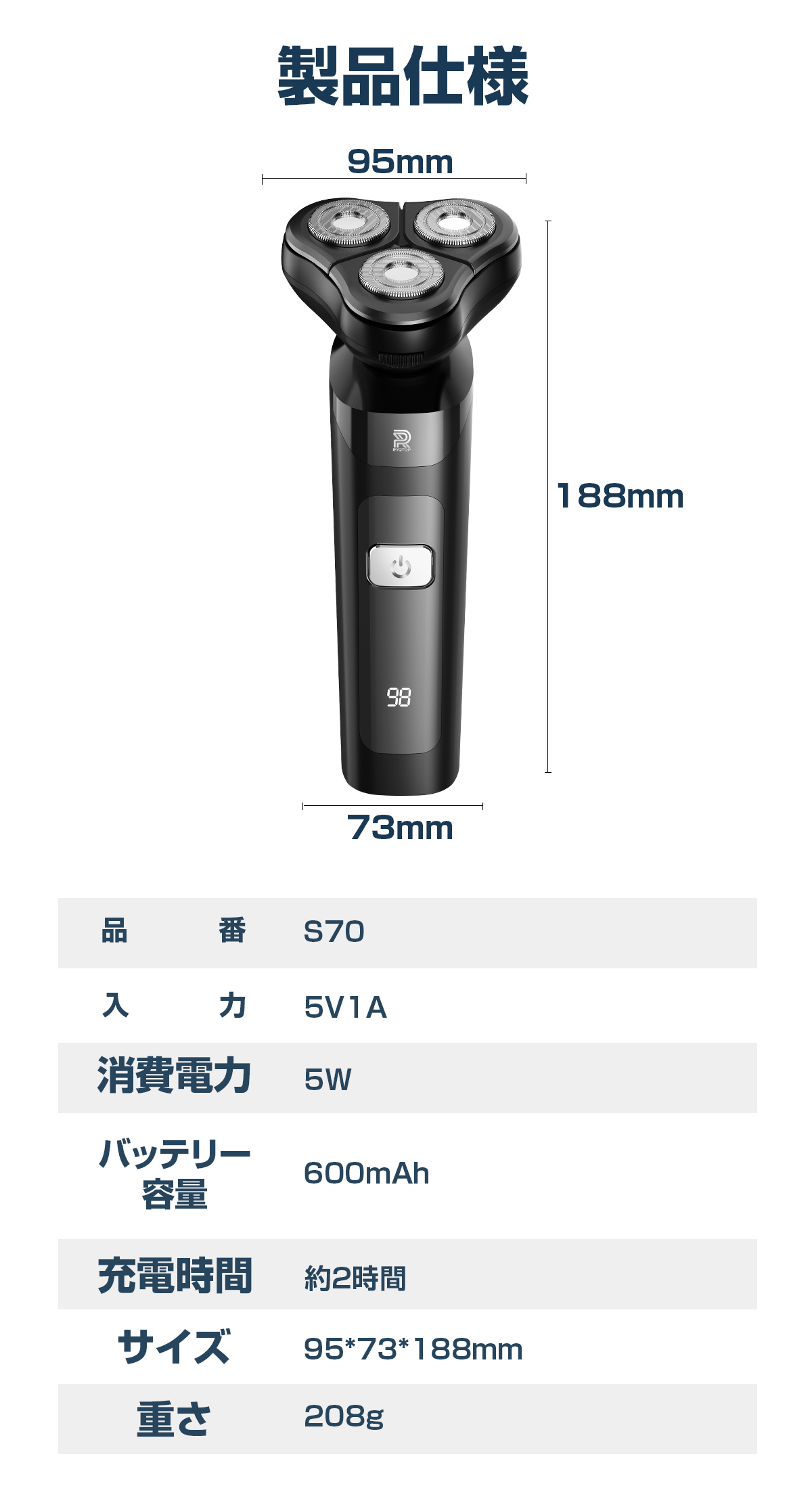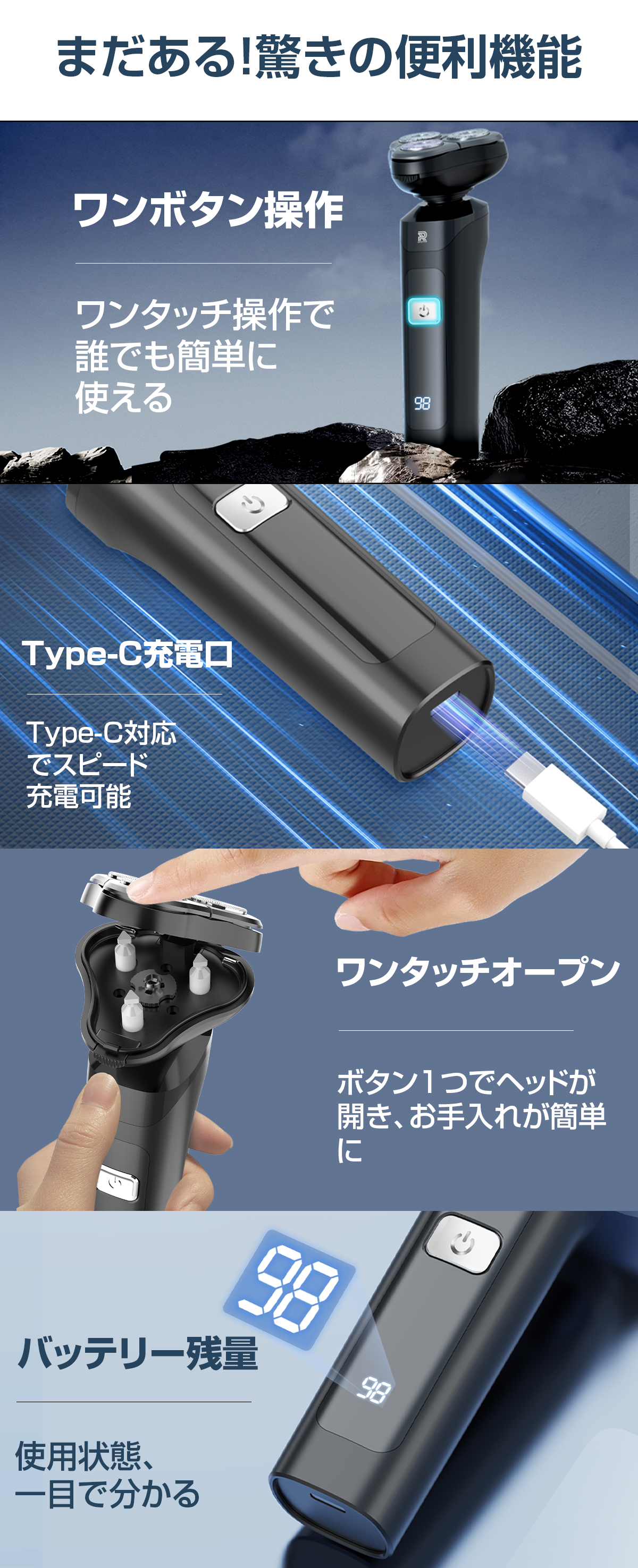 シェーバー メンズ 髭剃り 多機能シェーバー 3IN1 電気シェーバー ひげそり 電動ひげそり 回転式 3枚刃 LCD電池残量表示 防水 type-c充電 ロック機能 トリマー刃