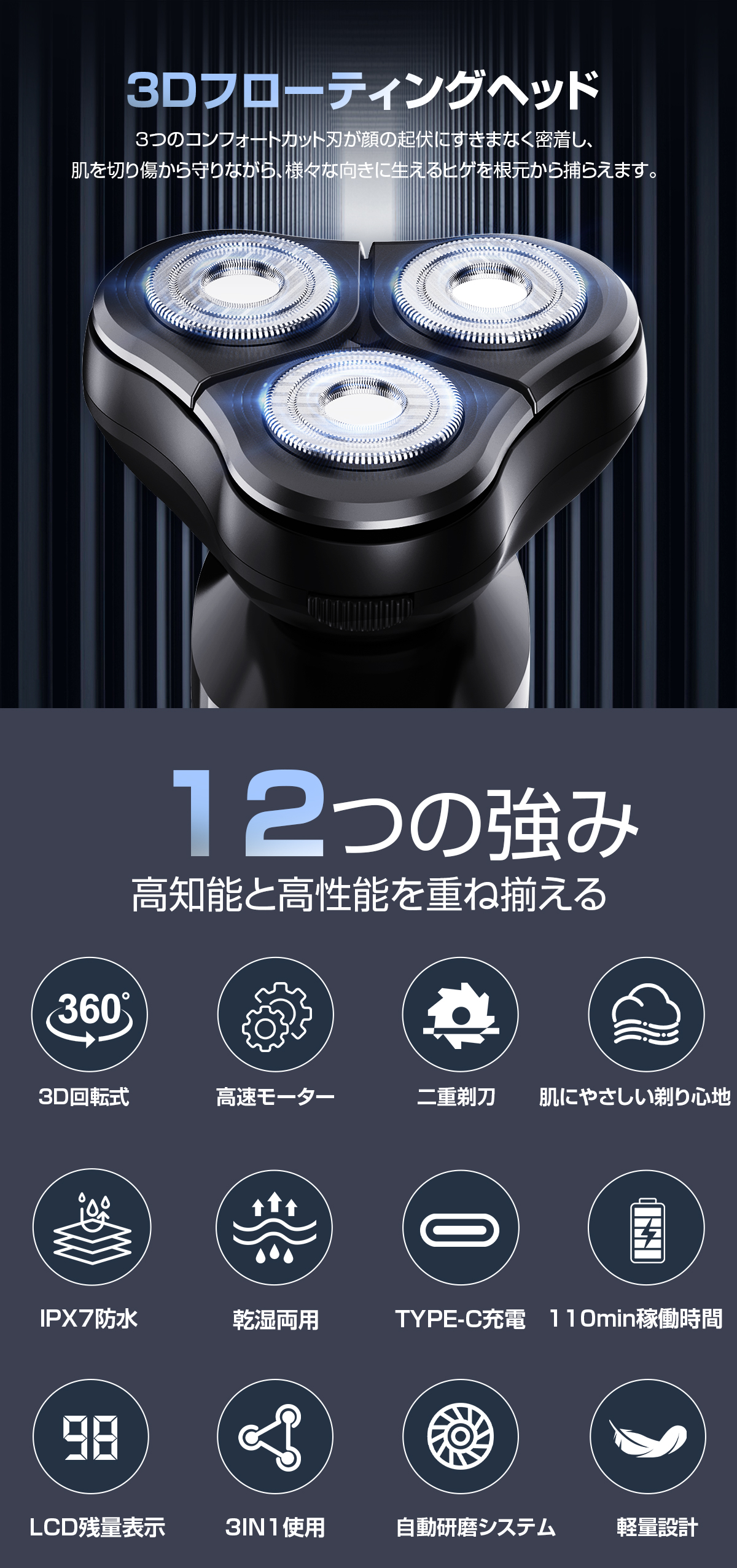★【3in1電気シェーバー・3D回転式360°】