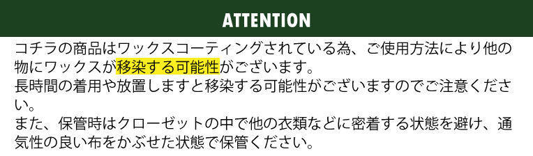 | 素材 | 表地コットン100%(WAXED) / 裏地コットン100% ※スポンジクリーニングのみ可能 |