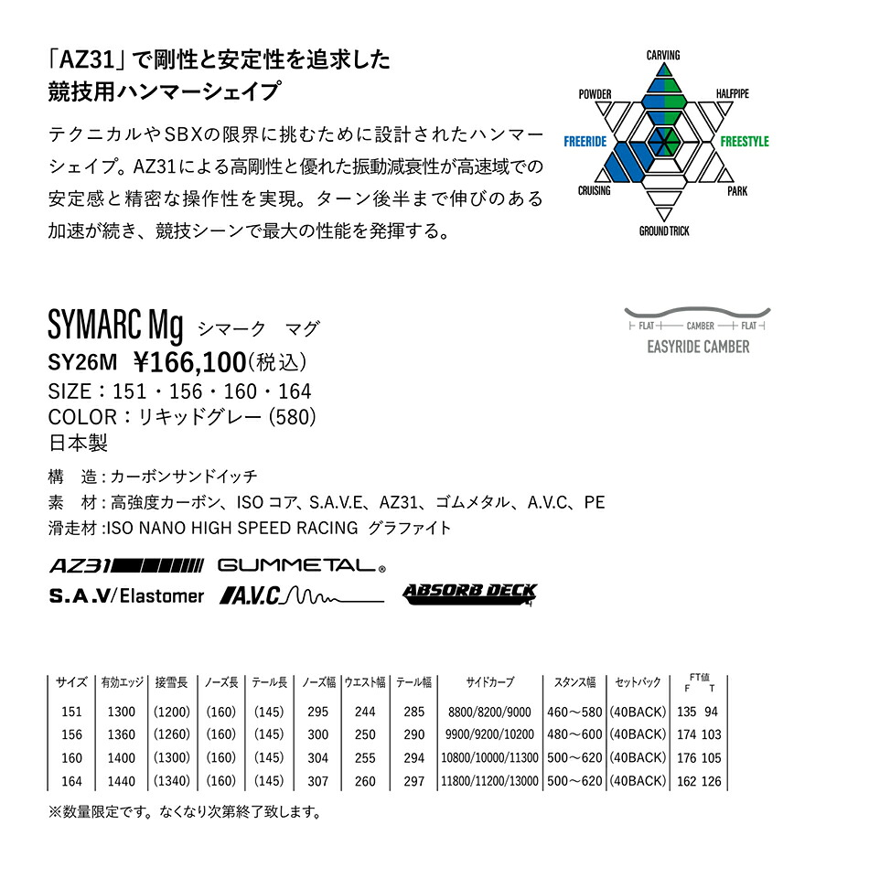 | 説明 | 商品概要 鋭い操作性で理想のラインを描くフルカービングボード ハンマーヘッドならではの伸びのあるターンと鋭いレスポンスが特長。スムーズな導入からエッジを効かせたターン後半まで、思い通りのラインを描ける。操作性と安定性を両立させ、テクニカル志向のライダーに応えるフルカービングモデル。 基本情報 型番: SY26 価格: ¥127,600(税込) サイズ: 151・156・160・164 カラー: レッド(001) 原産国: 日本製 構造: カーボンサンドイッチ 素材: 高強度カーボン、ISO コア、ゴムメタル、A.V.C.、PE 滑走材: ISO NANO HIGH SPEED RACING グラファイト |