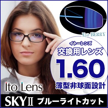 Ito Lens イトーレンズ 非球面 SKY2 1.60 屈折率:1.60 比重:1.30 コート:ブルーライトカットコーティング 設計:非球面設計 |