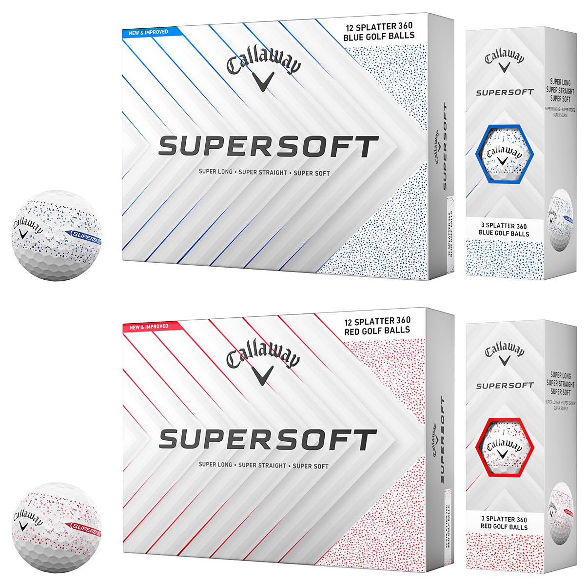 スプラッターデザインも通常製品に仲間入り新しい「SUPERSOFTボール」は、ラインアップも注目のポイントです。カラーには、ホワイトとレッドに加え、これまで限定発売で登場してきたスプラッターデザイン入りのブルーとレッドも通常製品として用意されました。スプラッターデザインは、ボールの1周360度にわたって、色のついた細かな点が帯状にスプレーされたようなスタイルのため、パターなどのアドレス時ではあまり目に強く入らず、回転したときには太い線に早変わり! ストロークの際は気にならず、ボールの転がりはしっかり確認できるという優れものです。また、帯状のため、ボールを正しくセットする際のアライメントとしても活用ですることができます。なお、すべてのラインアップに、両サイドが矢印状になっている太めのラインのアライメントも描かれており、線のなかには「SUPERSOFTボール」のロゴが入れられています。