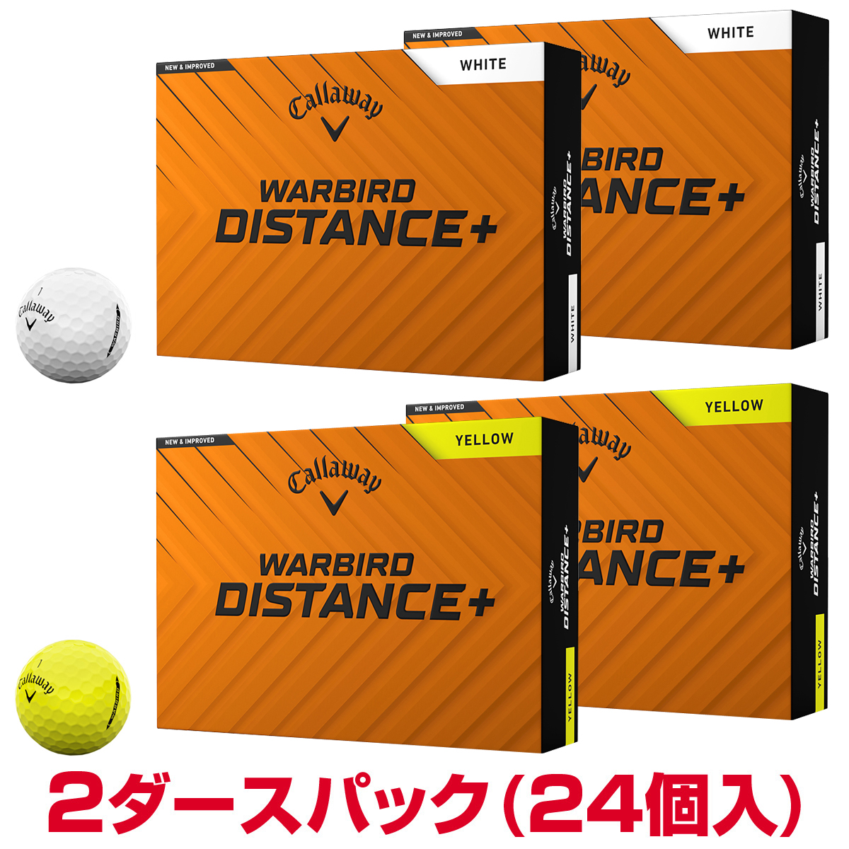 ソフトな打感でリニューアルキャロウェイでもっともお求めやすい価格のディスタンス系2ピース、WARBIRDボールが、「WARBIRD DISTANCE+ボール」へとリニューアルされました。もちろん、変わったのは名前だけではありません。優れた反発性を持つ高エネルギーコアと、アプローチでの止まりやすさを持ち合わせたトライ・ブレンド・アイオノマーという構造自体は前作と同様ですが、使用する素材をより品質の高いものにアップグレード。高い飛距離性能は保持しながら、前作までの硬めのフィーリングのものから、より心地良い打感をもたらす製品へと進化しました。カラーは、ホワイトとイエローの2種類をラインアップ。どちらにも、グリーン上で役立つ、両サイドが矢印状になった太めのラインカバーが描かれています。