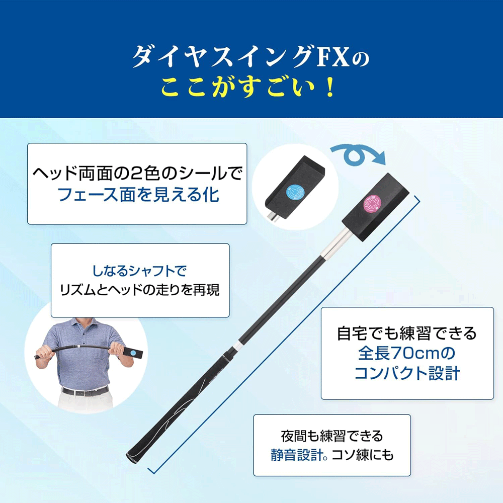 ヘッド部分に2色のシール(ブルー・ピンク)が貼られており、インパクト時のフェース面の開閉状態をスイングしながら判別できます。また、しなるシャフトによりスイングリズムの乱れや手打ちを体感的に修正できます。全長約70cmの静音設計で、自宅や室内でも周囲を気にせず練習が可能です。「自分のスイングが正しいのか分からない」「飛距離や方向が安定しない」といった課題を感じ始めた中級者層に向けて、自宅で確かな気づきを得られるスイング練習器具です。
