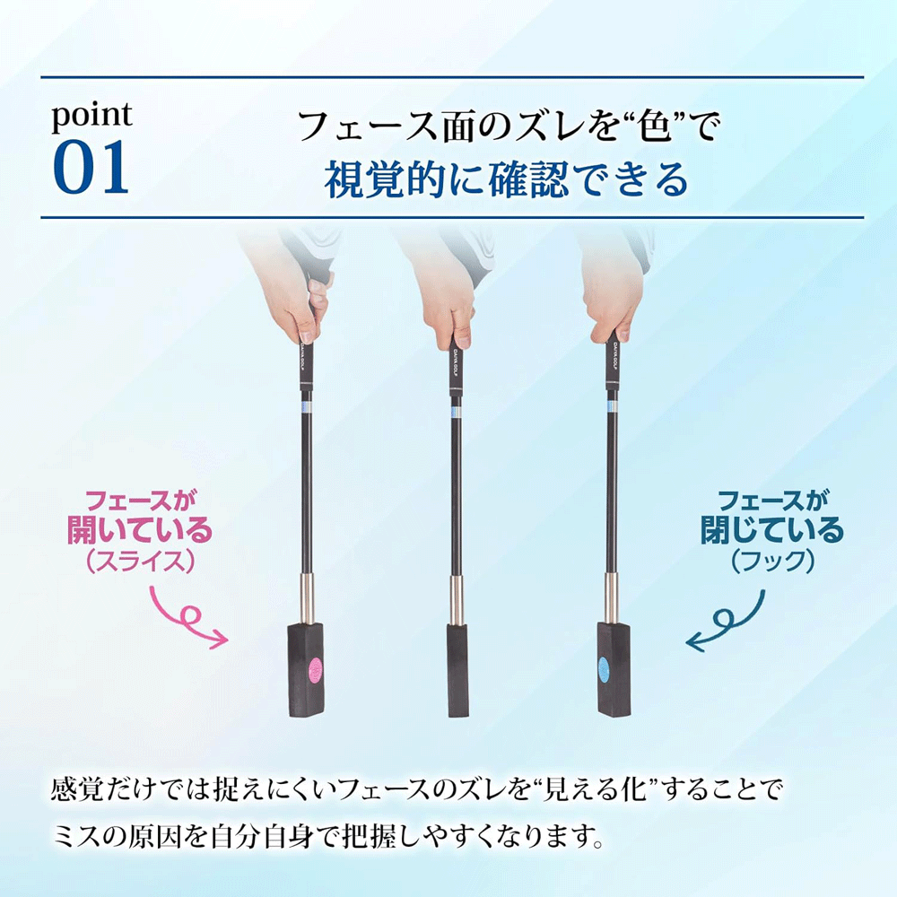 フェース面のズレを“色”で視覚的に確認できるヘッドヘッド先端にはブルーとピンクの目印が装着されており、インパクト位置で見える色によってフェース面の向きを可視化できます。ブルーが見えればフェースが閉じ(フック)、ピンクが見えれば開いている状態(スライス)。感覚だけでは捉えにくいフェースのズレを“見える化”することで、ミスの原因を自分自身で把握しやすくなります。