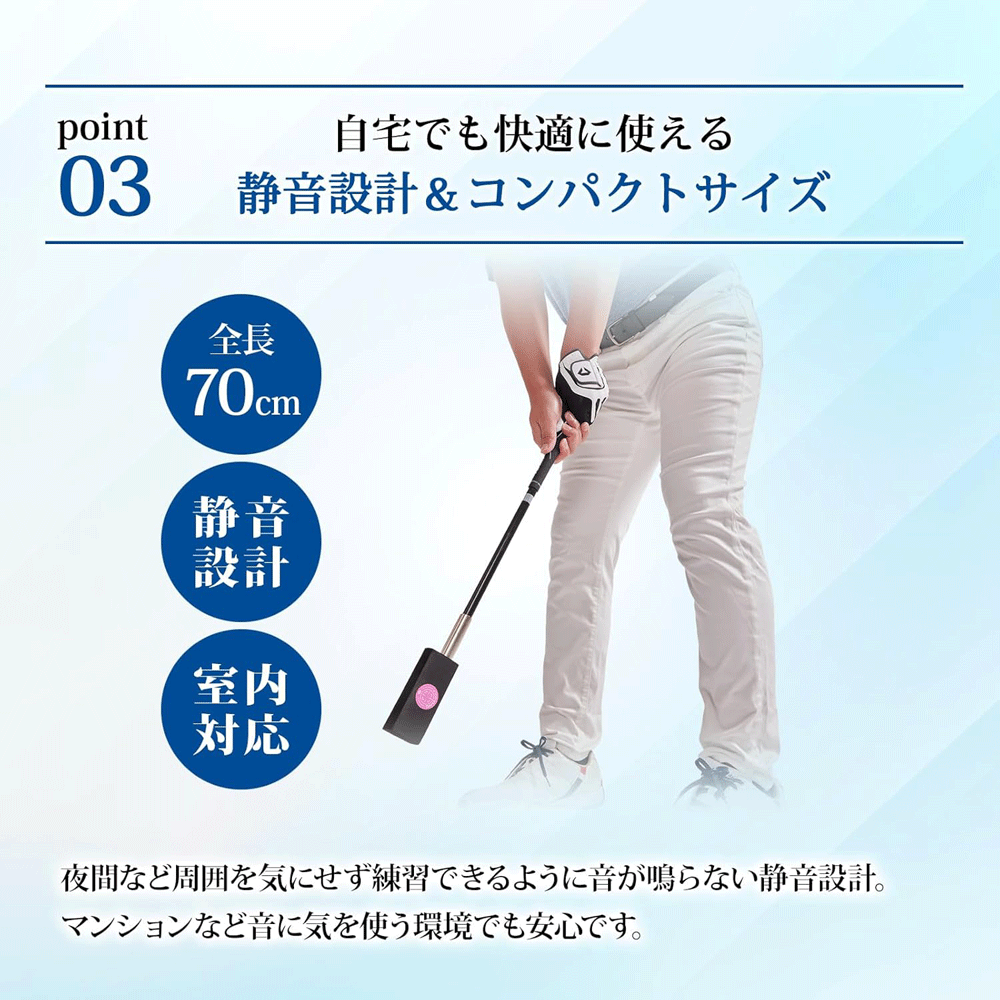 自宅でも快適に使える静音設計&コンパクトサイズ全長約70cmの設計で、室内でも使いやすいサイズです。本品は夜間など周囲を気にせず練習できるように音が鳴らない静音設計を採用。、マンションなど音に気を使う環境でも安心です。場所や時間を選ばず、自宅や職場などの空き時間に気軽にスイング練習を行うことができるので、習慣化しやすいゴルフ練習を実現します。