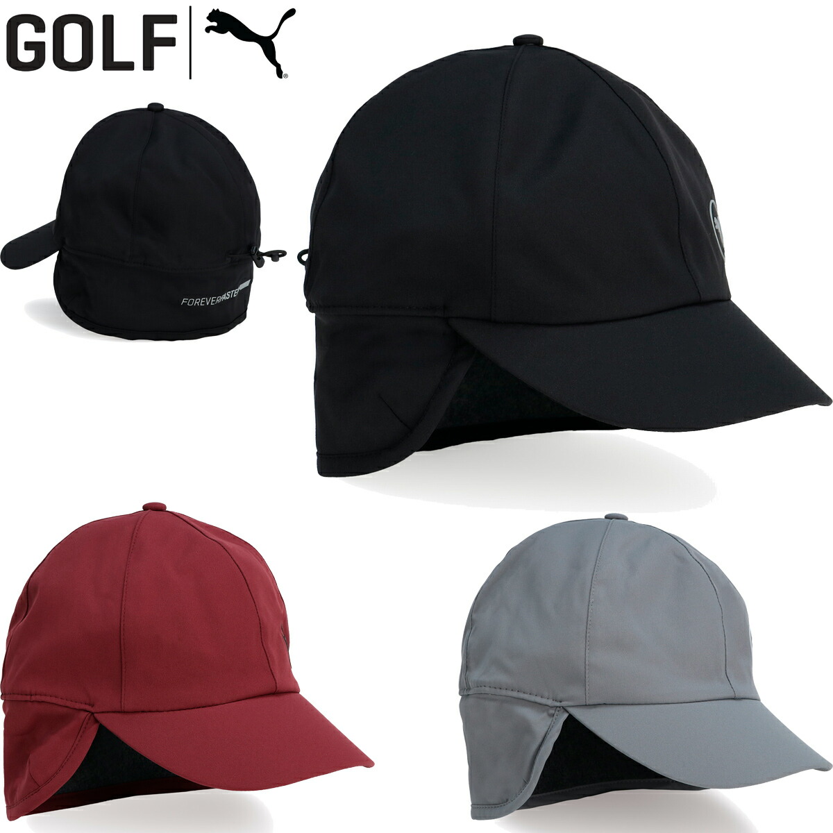 撥水加工(C0撥水)を施したストレッチ素材。耳当て付き。頭裏はフリース。クラウン左前パネルに「サークルCAT」ロゴのTPU。 耳当てバックに「FOREVER FASTER.PUMA」ロゴプリント。ドローコードでサイズ調整可能。