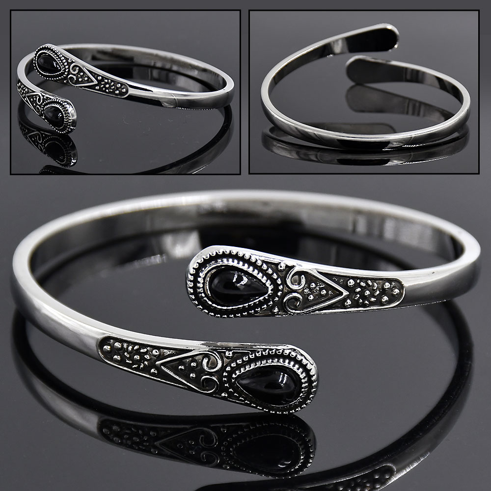 ボーナスストア対象 バングル C字型 カフブレスレット ブラックストーン シルバー 黒 腕輪 金属 アンティーク調 ジュエリー カジュアル エスニック