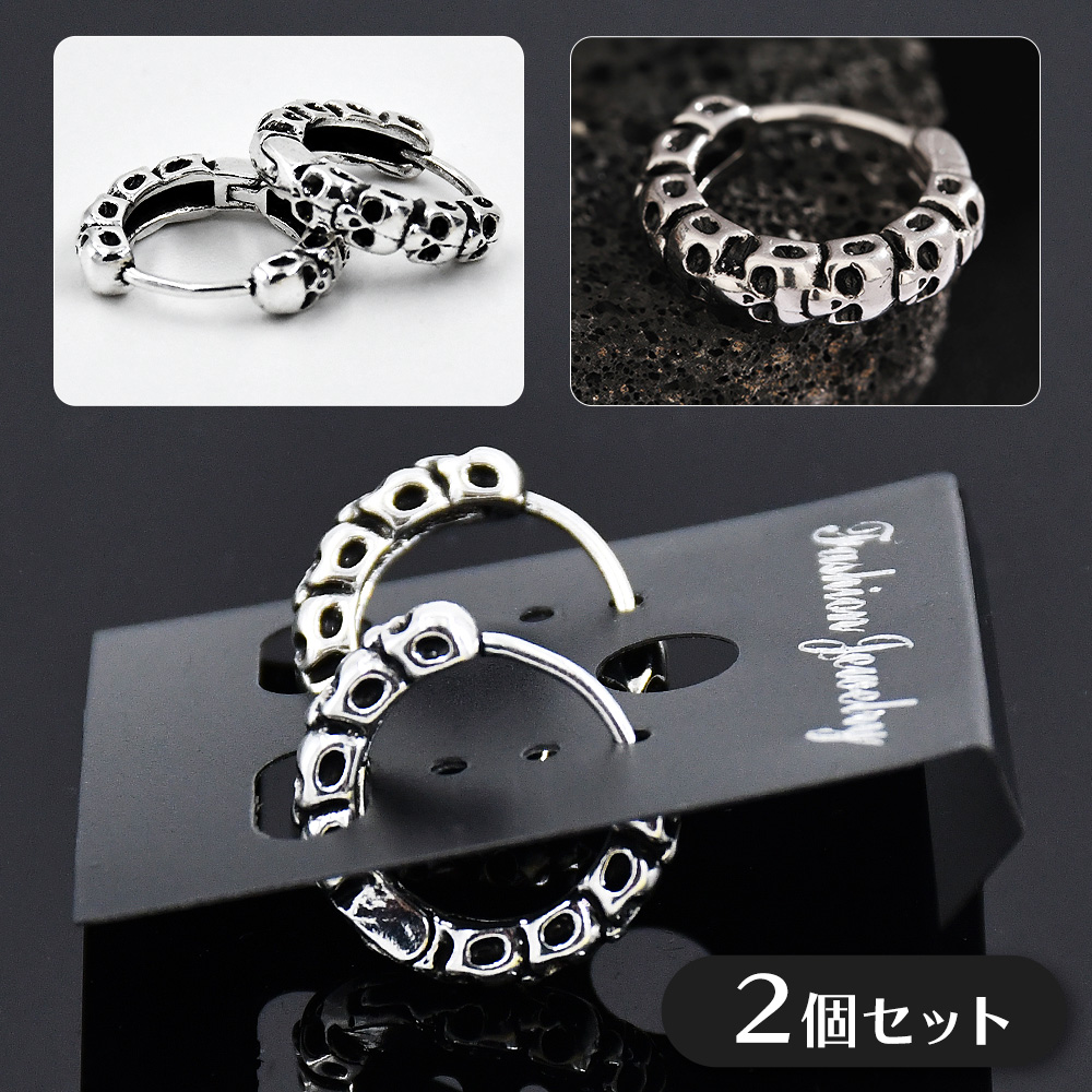2セット フープピアス スカル 両耳セット 中折れ式 シンプル ドクロ 骸骨 シルバー 銀 2個1組 ギフト ストリート ロック パンク 男女