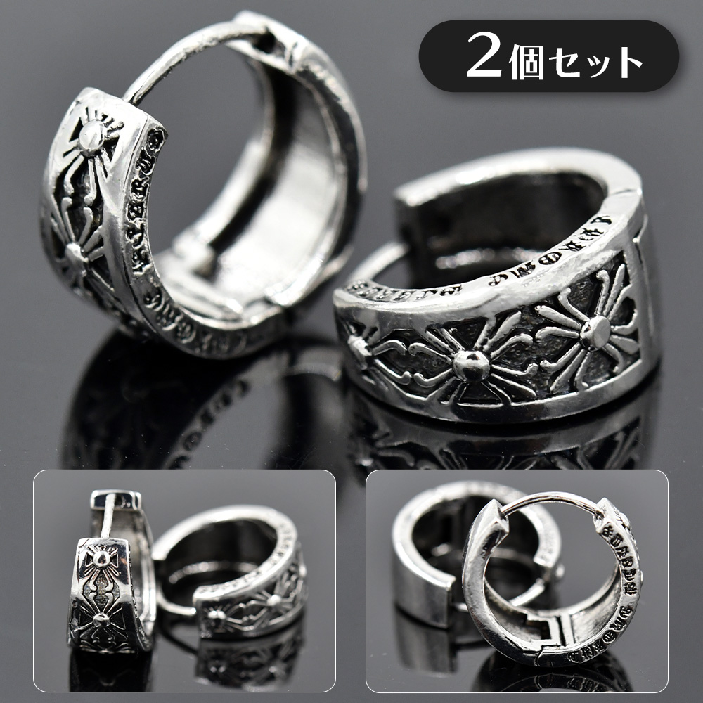 2個セット フープピアス クロスモチーフ 花十字 重厚感 中折れ式 両耳セット ぴあす シルバー 2個1組 ストリート メンズ ロック