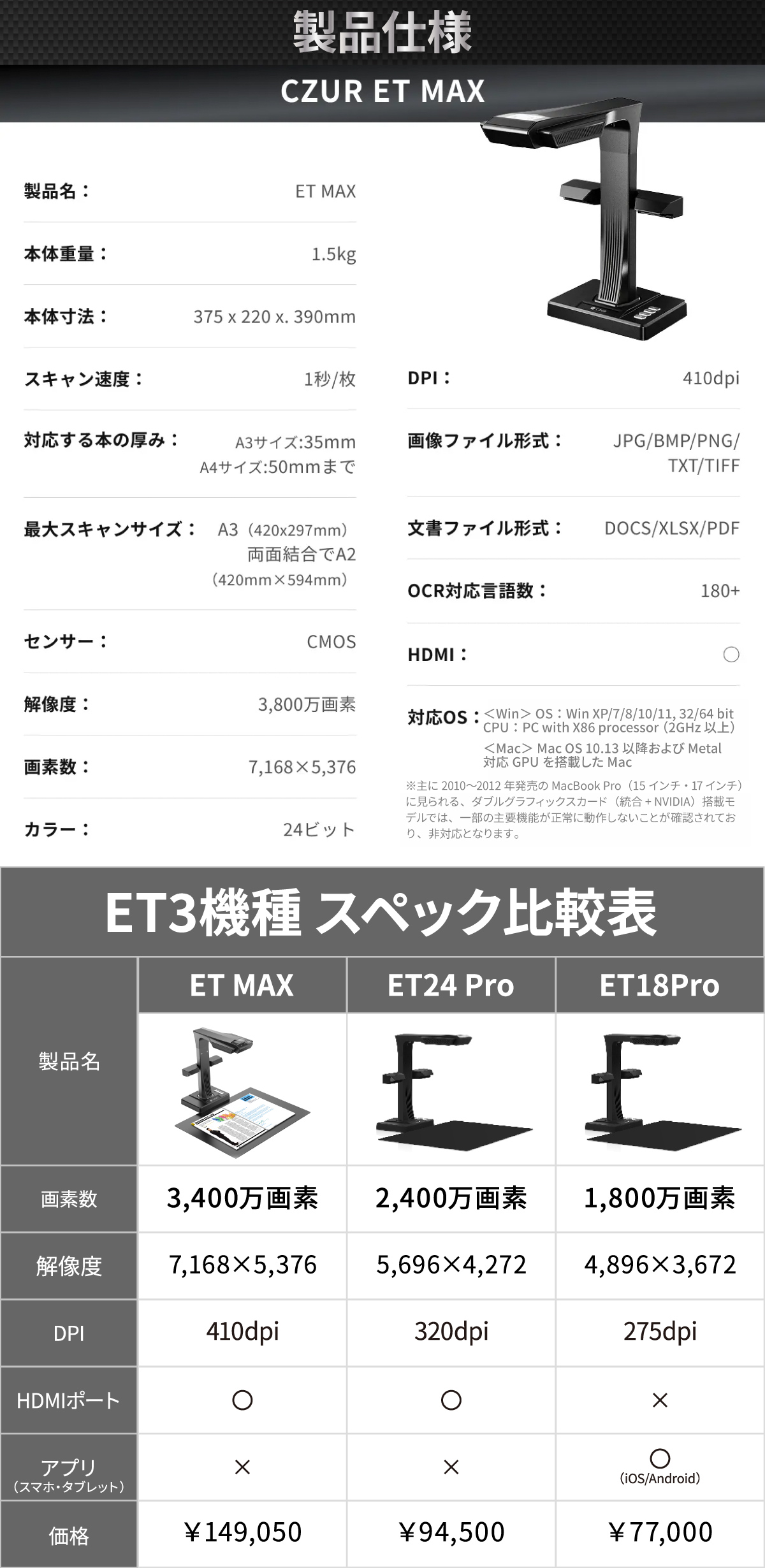 | CZUR ET MAX 製品仕様 | |