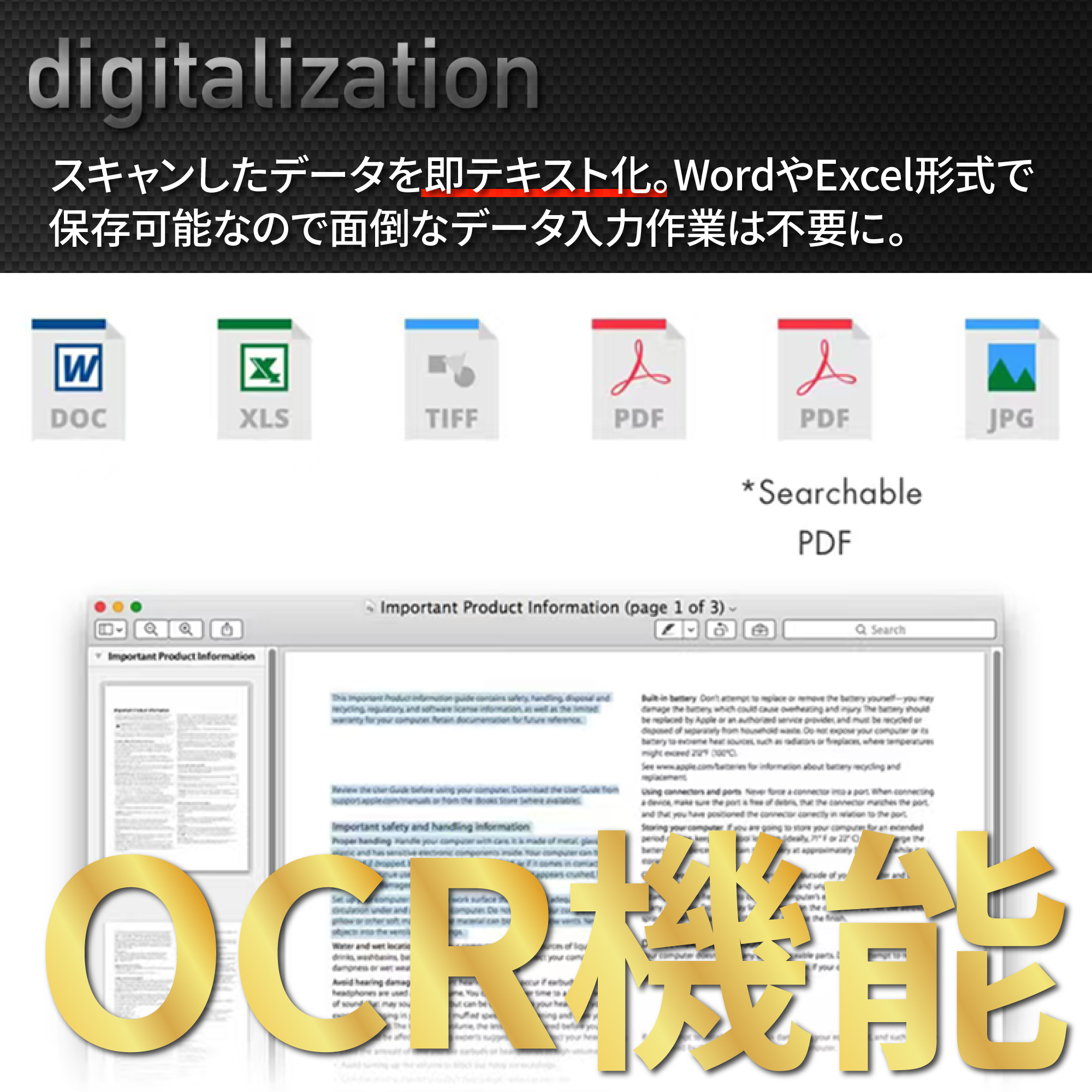 | 出力フォーマット | JPEG、PDF、サーチャブルPDF、Word、Excel、TIFF |
