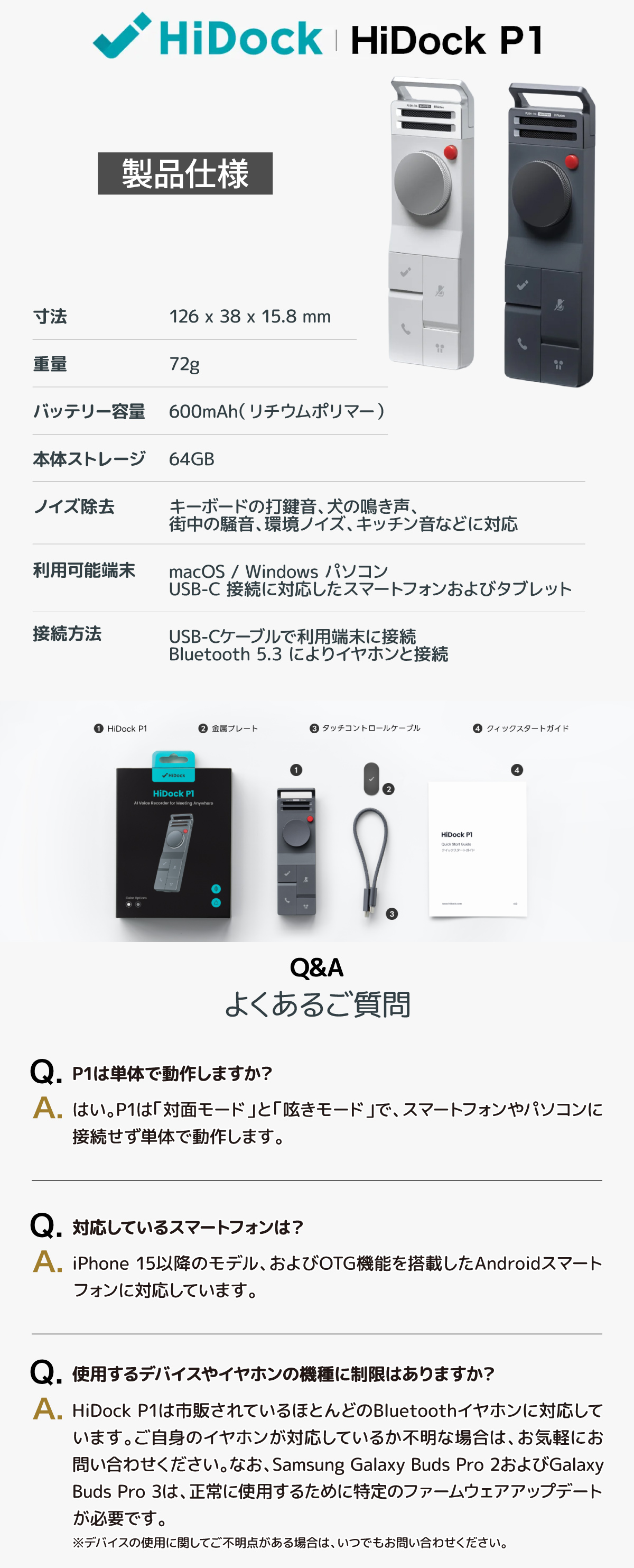 HiDock P1 AI ボイスレコーダー 文字起こし 要約 LLM利用 仕事効率化AIツール ワイヤレスイヤホン ECMマイク ワンタッチ録音 通話/対面 75言語対応 アプリ連動