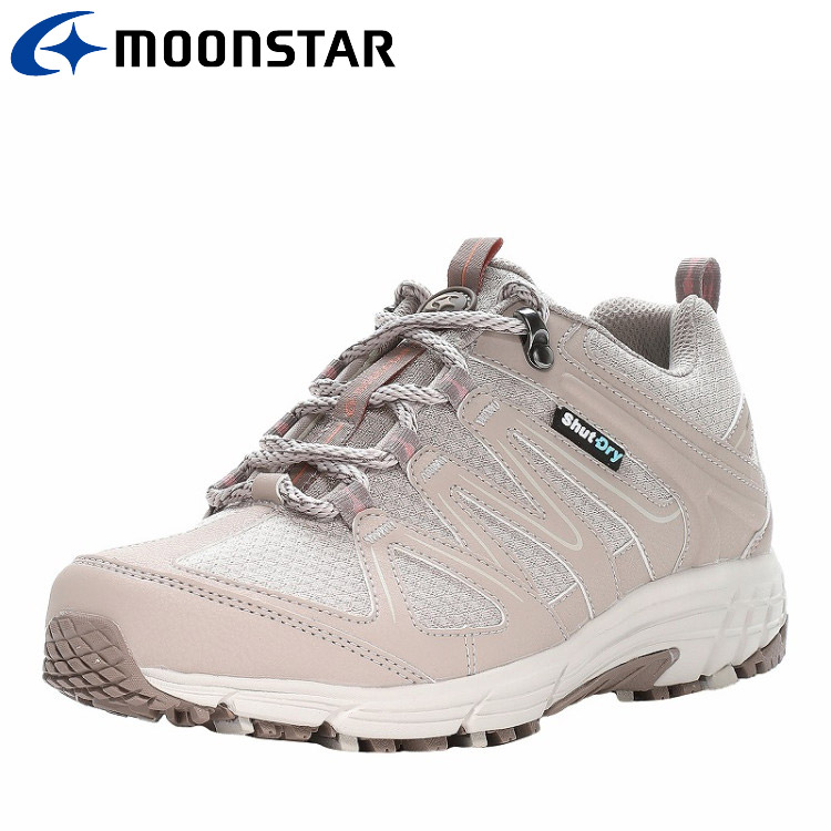 ムーンスターのレディースアウトドアスニーカーです。ムーンスター独自の透湿防水テクノロジー「Shut Dry(R)」を搭載しています。靴内への水の浸入を防ぎ、湿気は外に逃がす透湿防水機能で1年中快適な履き心地です。様々なアスレチックライフスタイルで活躍します。ミッドソールには反発弾性力が優れたEVAを採用し、アウトソールにはすり減りにくい耐久性の優れたラバーを採用しています。その他、快適機能が満載の高機能シューズです。トレッキングやキャンプ、アスレチックなどアウトドアレジャーはもちろん、屈曲性にも優れているのでウォーキングやタウンユース、旅行などにも幅広く活躍します!ヒールの高さは4.0cmで、重量は23.0cmで片足約300gです。【4E】足幅の広い方に対応した商品です。【つま先ゆったり】つま先にゆとりをもたせた形状で、足の指を圧迫せずにのびのび動かせます。【サラリーナ】汗や水分を素早く吸収・拡散し、靴内をサラサラな状態に保つメッシュを使用しています。【Ag+抗菌防臭】銀イオン