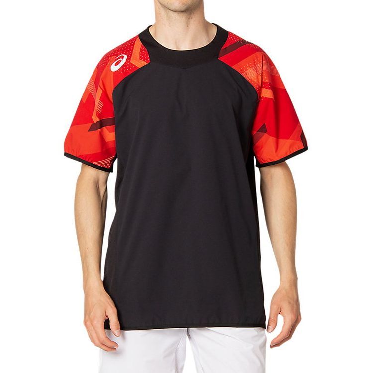 ジャポニズムデザイン(21SSバージョン)。肩切替:昇華プリントでデザインを表現。動きを妨げにくいように伸縮性があるストレッチクロス素材を使用。前後身頃:動きを妨げにくいように伸縮性があるストレッチクロス素材を使用。脇切替:通気性を意識し、メッシュ素材を使用。男子日本代表着用予定アイテム。