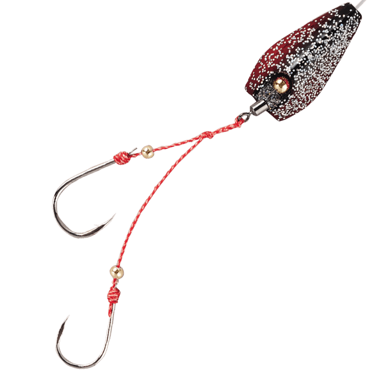 リフト&フォールで妖しくゆらめくインチク形状。ロングシャンクが海エビをしっかりホールドする小鯛鈎を使用しています。ヘッドとフックを遊動にする事により、フックUP後の鯛特有の首振りによるバラシを激減。またフォール中にバイトしてきた鯛に違和感を与えず喰い込ませる事を可能にしました。
