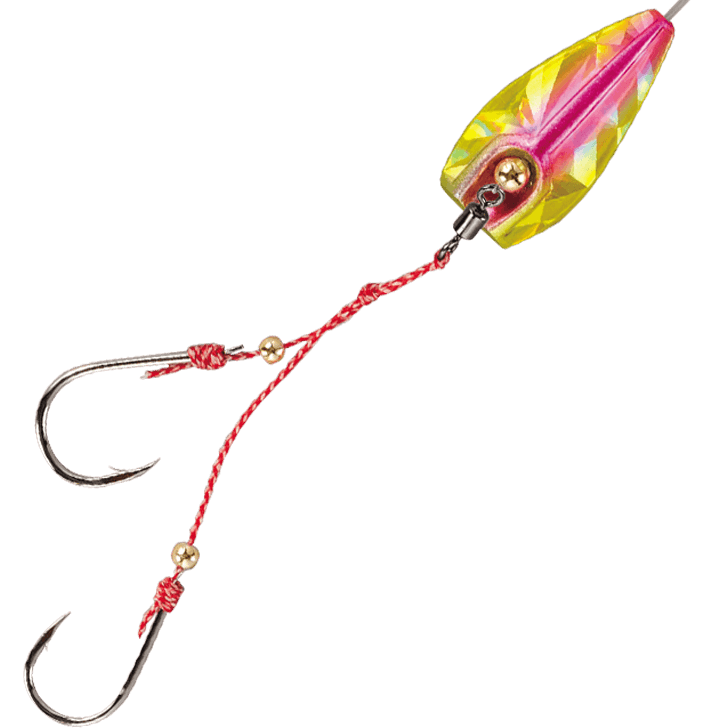 リフト&フォールで妖しくゆらめくインチク形状。ロングシャンクが海エビをしっかりホールドする小鯛鈎を使用しています。ヘッドとフックを遊動にする事により、フックUP後の鯛特有の首振りによるバラシを激減。またフォール中にバイトしてきた鯛に違和感を与えず喰い込ませる事を可能にしました。