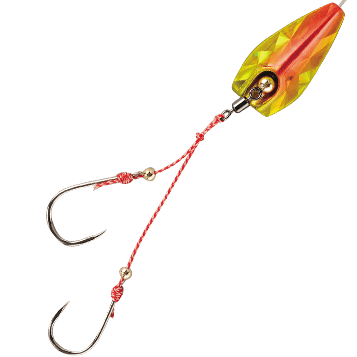 リフト&フォールで妖しくゆらめくインチク形状。ロングシャンクが海エビをしっかりホールドする小鯛鈎を使用しています。ヘッドとフックを遊動にする事により、フックUP後の鯛特有の首振りによるバラシを激減。またフォール中にバイトしてきた鯛に違和感を与えず喰い込ませる事を可能にしました。