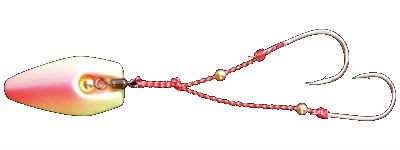 リフト&フォールで妖しくゆらめくインチク形状。ロングシャンクが海エビをしっかりホールドする小鯛鈎を使用しています。ヘッドとフックを遊動にする事により、フックUP後の鯛特有の首振りによるバラシを激減。またフォール中にバイトしてきた鯛に違和感を与えず喰い込ませる事を可能にしました。そして、ラバーセットを組み合わせる事で、今流行のキャスティング鯛ラバとしても使用する事ができます。