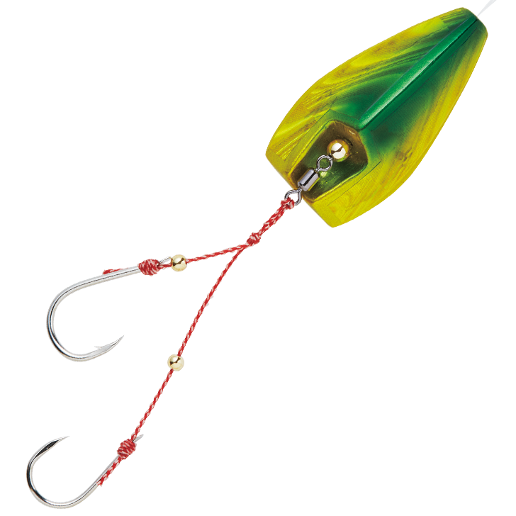 リフト&フォールで妖しくゆらめくインチク形状。ロングシャンクが海エビをしっかりホールドする小鯛鈎を使用しています。ヘッドとフックを遊動にする事により、フックUP後の鯛特有の首振りによるバラシを激減。またフォール中にバイトしてきた鯛に違和感を与えず喰い込ませる事を可能にしました。そして、ラバーセットを組み合わせる事で、今流行のキャスティング鯛ラバとしても使用する事ができます。