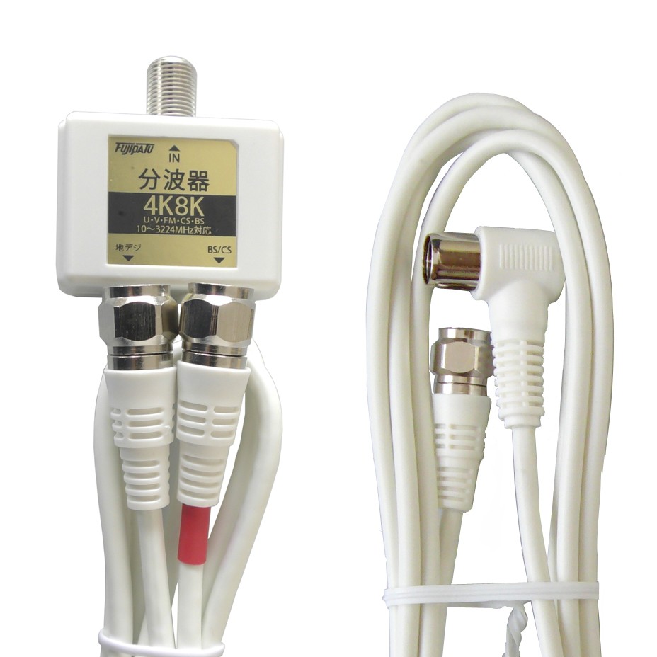 4K8K放送対応 アンテナ分波器 (BS/CS/地デジ対応) ケーブル一体型 F型-F型(0.5m) 2.5Cケーブル1.5m付き ホワイト FF-4879W