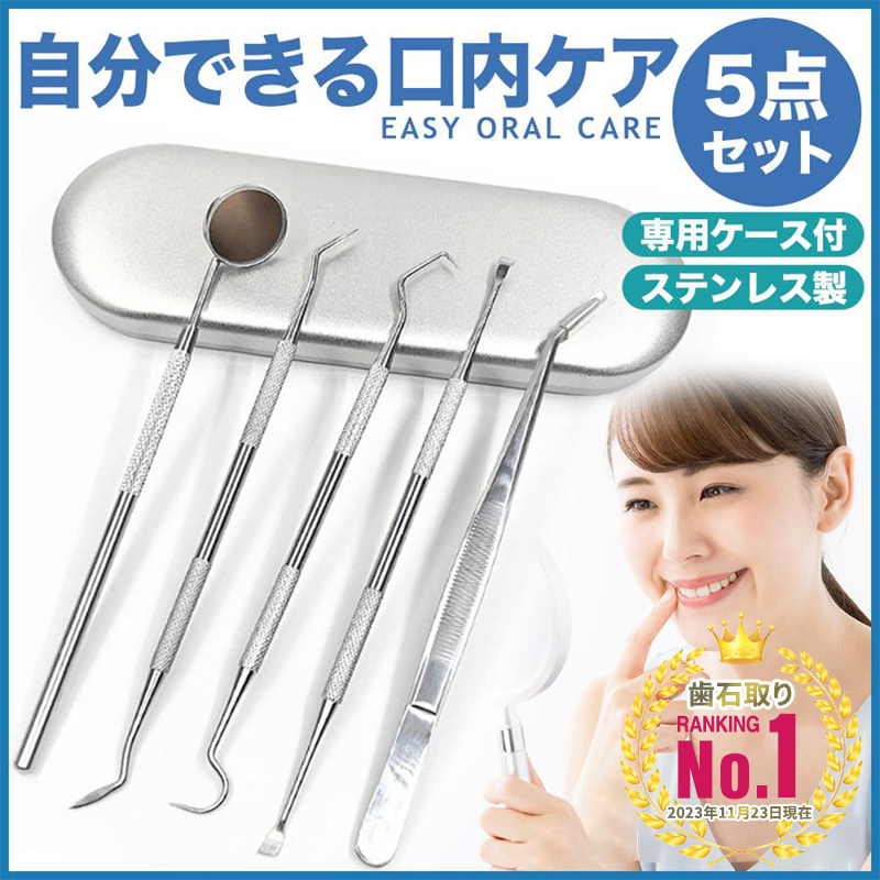 高級ステンレス製歯用ツール、初心者向けセット。自宅で本格汚れ除去、充実の5点セット。専用ケース付き