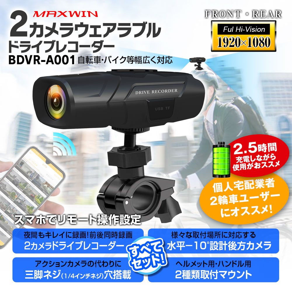 ドライブレコーダー バイク 自転車 2カメラ 前後同時 ヘルメット装着 WiFi 200万画素 フルHD LED信号対応 IPX4