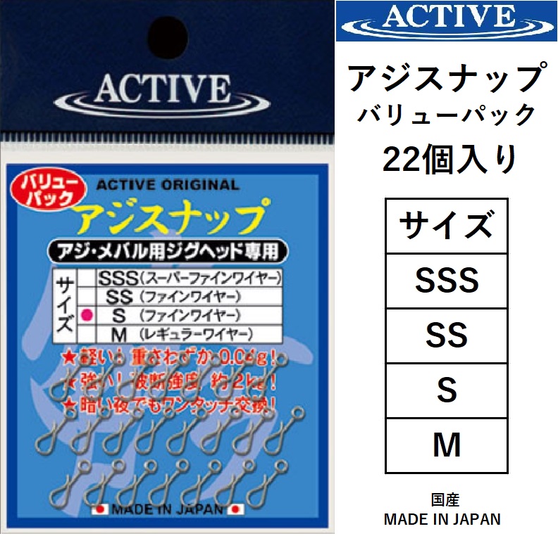 アクティブ/ACTIVE アジスナップ SSS,SS,S,M 接続パーツ アジ・メバル用スナップ ライトゲーム用パーツ バリューパック 国産 日本製 MADE IN JAPAN