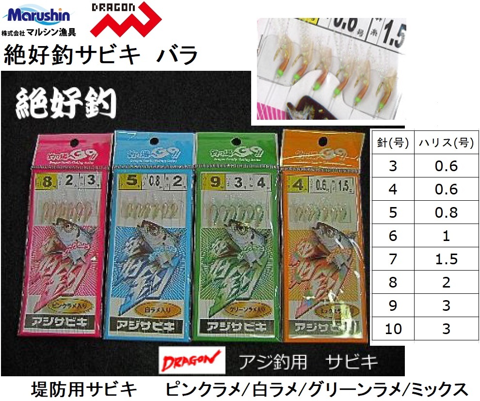 マルシン・ドラゴン 絶好釣アジサビキ(バラ) 3, 4, 5, 6, 7, 8, 9, 10号 アジ・イワシ用堤防サビキ仕掛け(メール便対応)