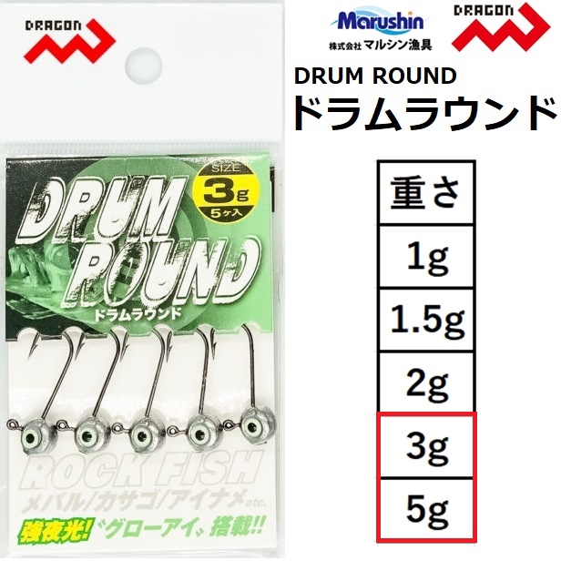 マルシン/ドラゴン JIGヘッドドラムラウンド 3g,5g 丸型ジグヘッド ルアー用ジグヘッド ライトゲーム 夜光 DRUM ROUND MARUSHIN DORAGON