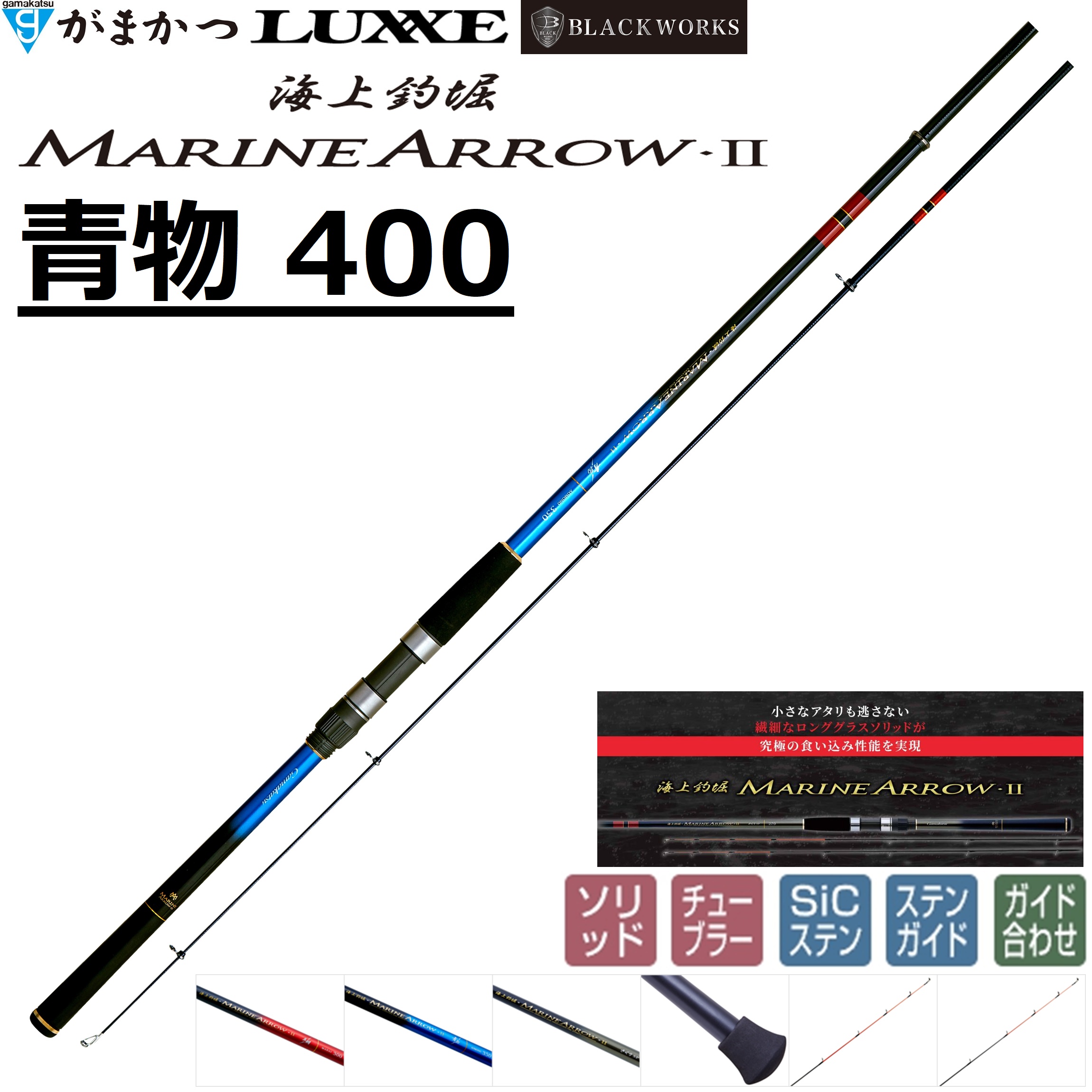 柔軟性を持つガラス繊維の比率が高いブランクで、魚の不意な突っ込みや、しつこい青物の突進に対しても引きの強さに応じて柔軟に曲り込んで粘るので、こらえているだけで大型魚でもバラすことなく楽に取り込めます。