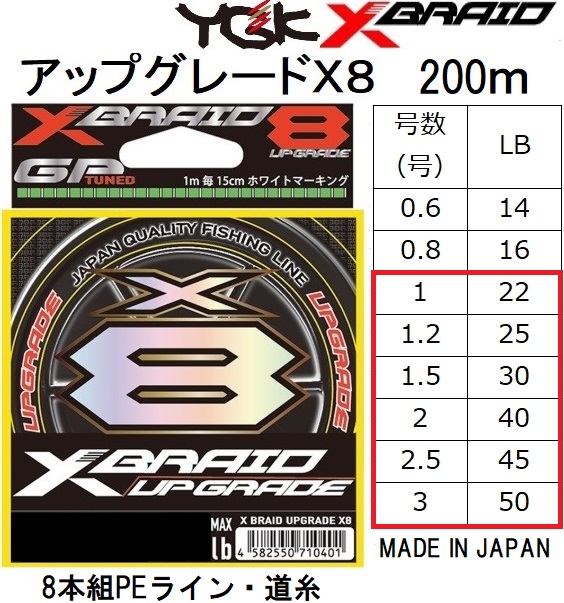 YGK・よつあみ XBRAID アップグレードX8 200m 1,1.2,1.5,2,2.5,3号 22,25,30,40,45,50Lbs 8本組PEライン・道糸エックスエイトUPGRADEエックスブレイド