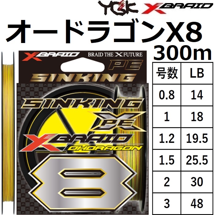 YGK・よつあみ XBRAID オードラゴンX8 SS1.20 300m 0.8, 1, 1.2, 1.5, 2,3号 8本組PEライン シンキングPE 国産・日本製 エックスブレイド