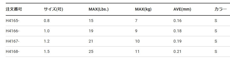 サイズ(号数) : 0.8、1.0、1.2、1.5 号