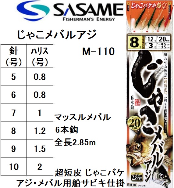 ささめ針/SASAME じゃこメバル・アジ M-110 マッスルメバル6本鈎 全長2.85m 5, 6, 7, 8, 9, 10号 サバ皮 アジ・メバル用船サビキ仕掛 ササメ(メール便対応)