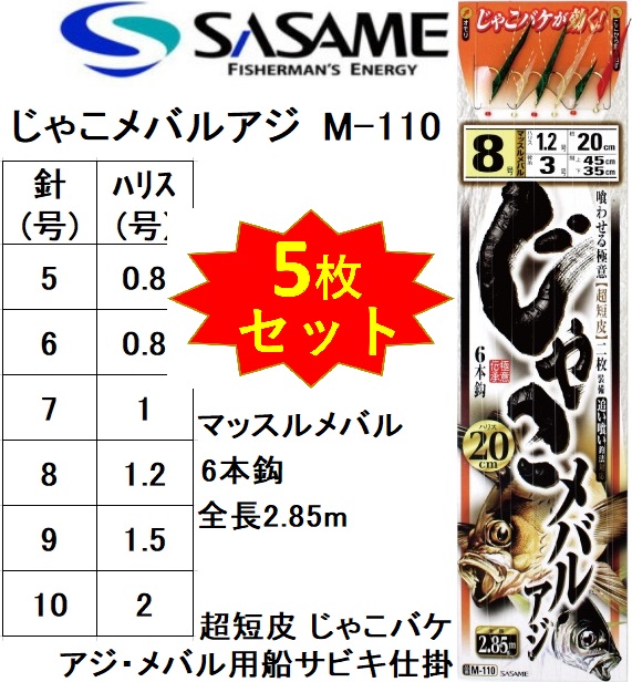(5枚セット)ささめ針/SASAME じゃこメバル・アジ M-110 マッスルメバル6本鈎 全長2.85m 5, 6, 7, 8, 9, 10号 サバ皮 アジ・メバル用船サビキ仕掛 ササメ