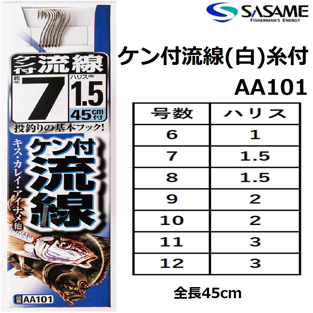 ササメ/SASAME ケン付流線(白)糸付 全長45cm AA101 6-1,7-1.5,8-1.5,9-2,10-2,11-3,12-3号 替え針 仕掛け針 糸付鈎