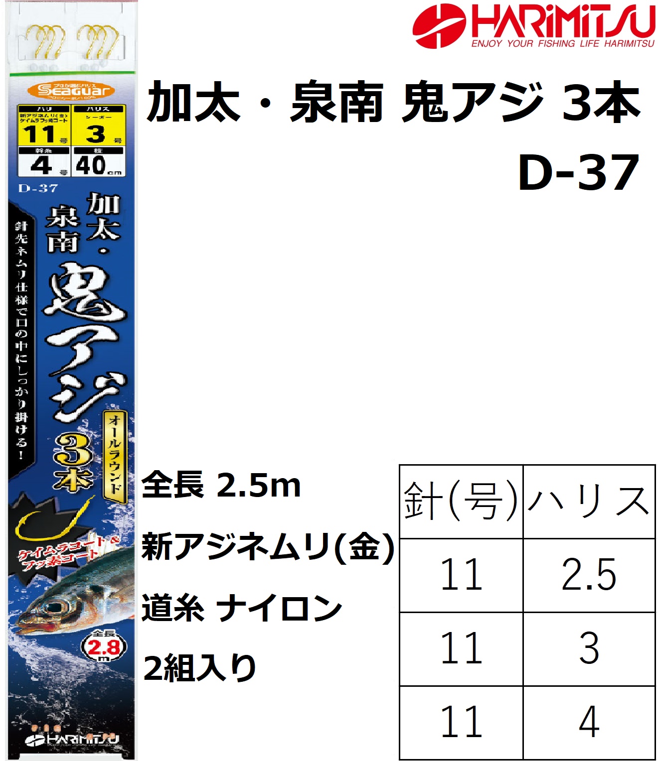 ハリミツ/HARIMITSU 加太・泉南鬼アジ3本 D-37 11-2.5,11-3,11-4号 全長1.5m 2組入り 船アジ・底物仕掛け 2本鉤