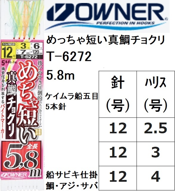 オーナー/OWNER めっちゃ短い真鯛チョクリ T-6272 ケイムラ船五目5本針 全長5.8m 12-2.5, 12-3, 12-4号 船用真鯛サビキ仕掛け・ビニール アジ・サバ