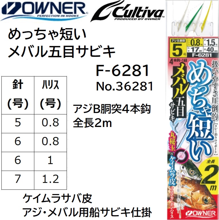 オーナー/OWNER めっちゃ短いメバル五目サビキ F-6281 アジB胴突4本針 全長2m 5-0.8, 6-0.8, 6-1, 7-1.2号ケイムラサバ皮 アジ・メバル船サビキ仕掛けNo.36281