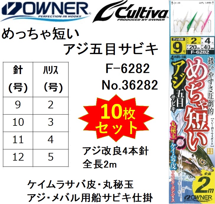 (10枚セット)オーナー/OWNER めっちゃ短いアジ五目サビキ F-6282 アジ改良4本針 全長2m ケイムラサバ皮・丸秘玉 アジ・メバル船サビキ仕掛けNo.36282